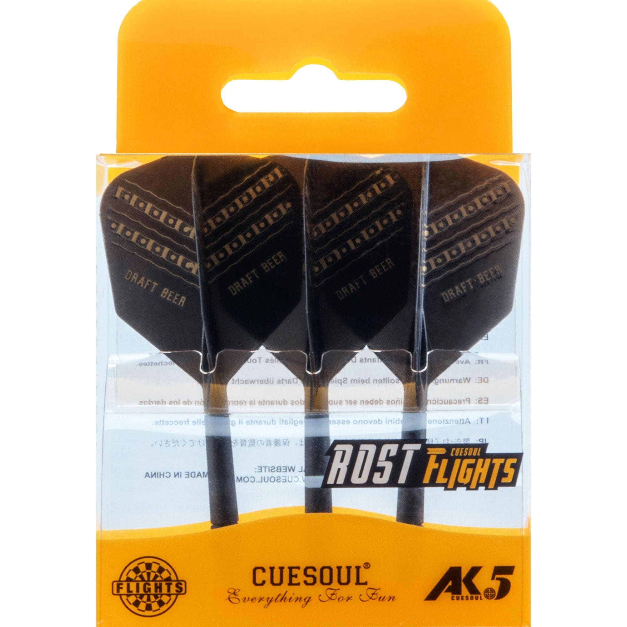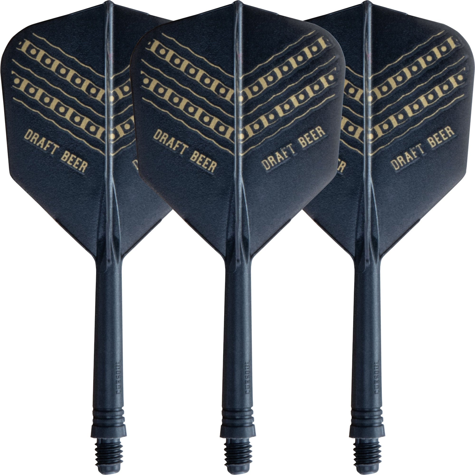 Cuesoul - Tero Dart Flights - Standard - Solid - Black with Draft Beer design. Precision moulded to ensure the flights retain 90° for each throw. The black Draft Beer flights feature a reinforcing rib moulded on the top and bottom of the flight to protect against tearing during throw. The medium black shaft is measured for what is visible once the dart is assembled. Shaft length: 28mm