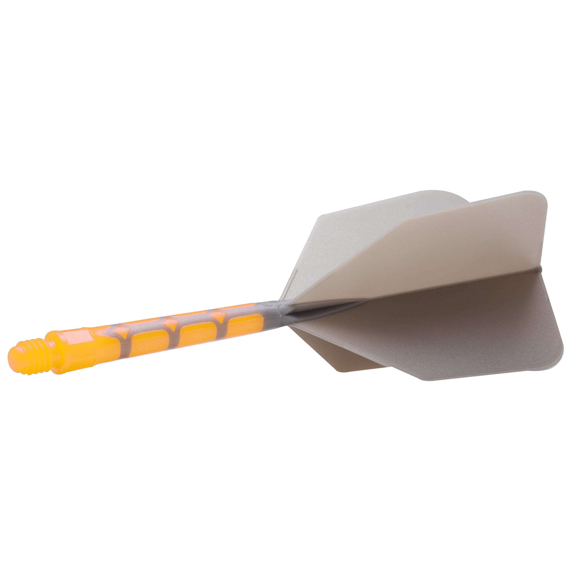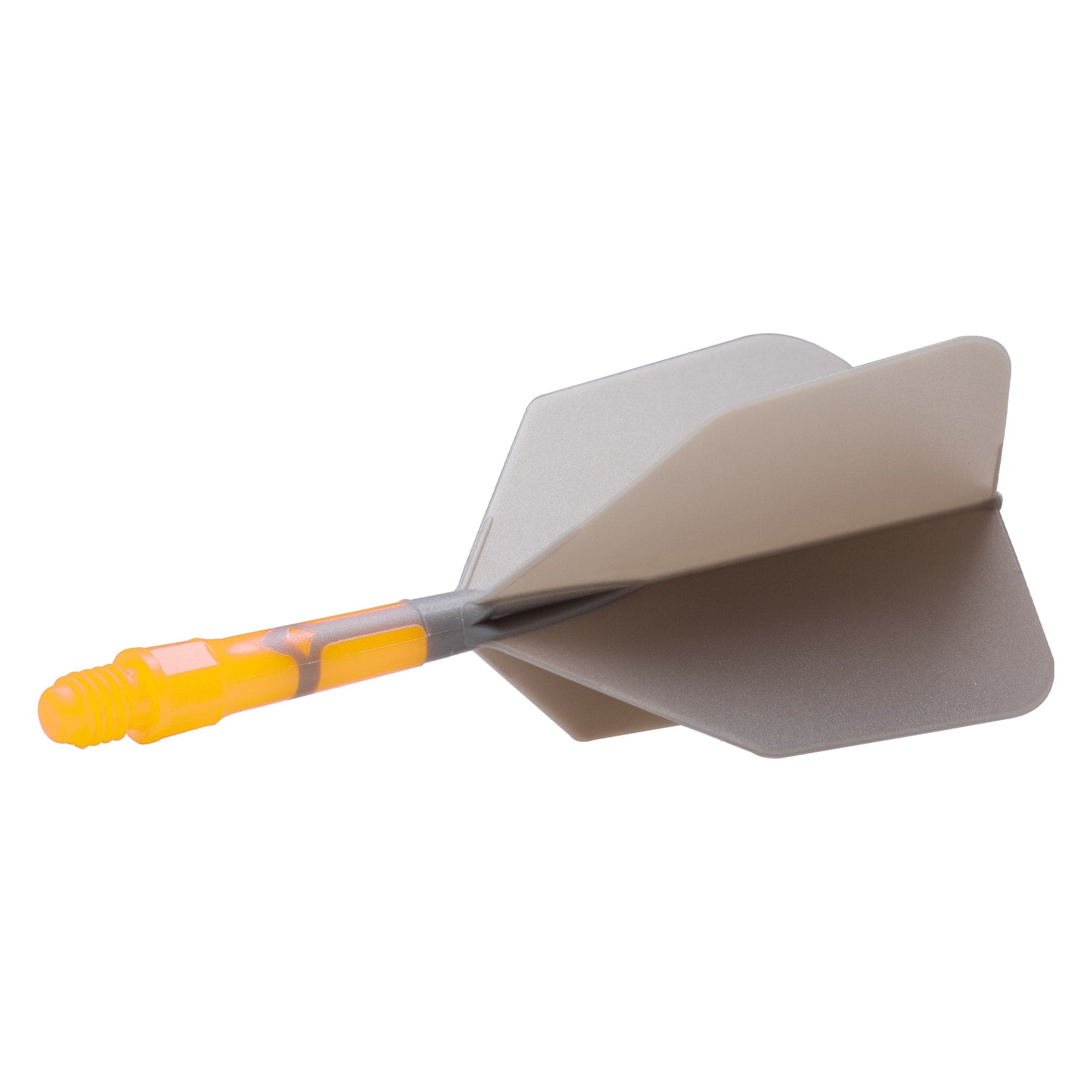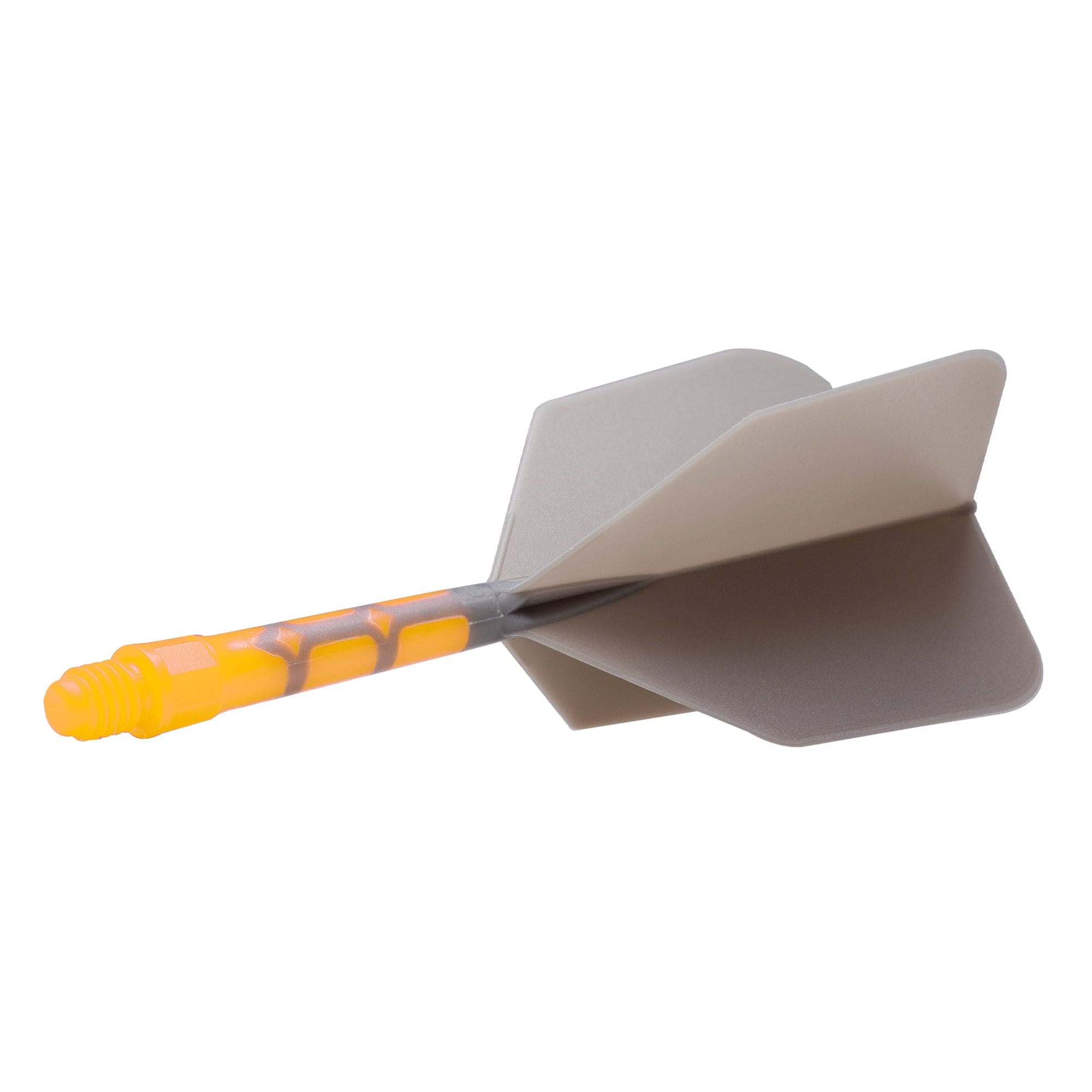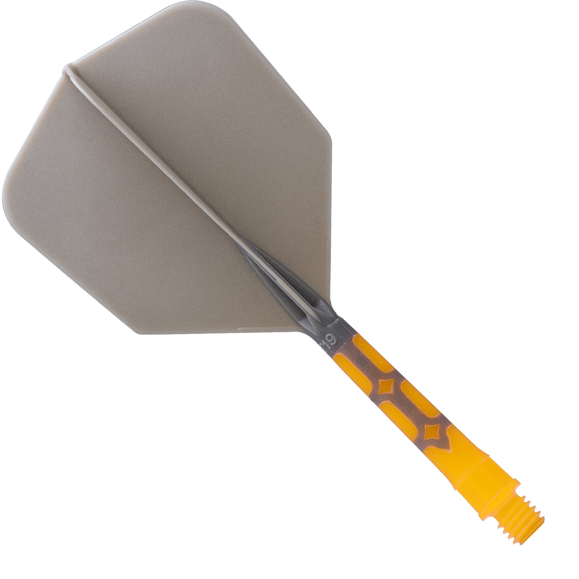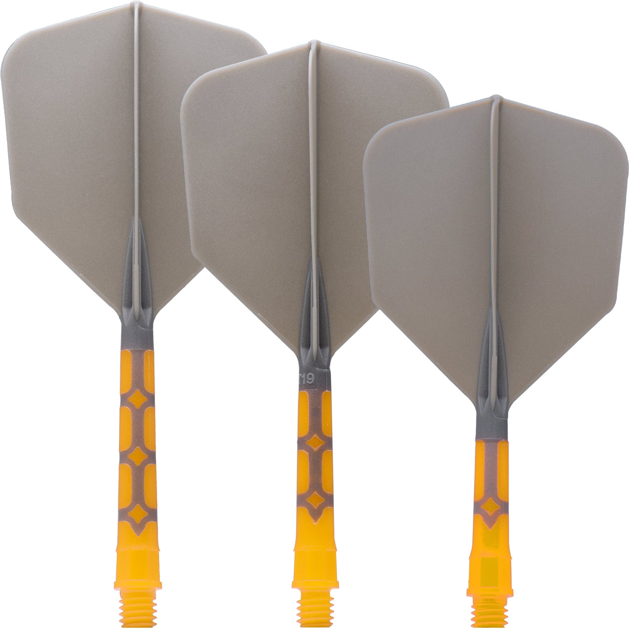 Cuesoul Rost T19 Integrated yellow dart shaft and big wing grey flights. This fully moulded system screws into the barrel, just as with a standard stem. The grey moulded flight features a reinforcing rib to help prevent Robin Hooding. The medium yellow dart shaft is measured for what is visible once the dart is assembled. Shaft length: 28mm