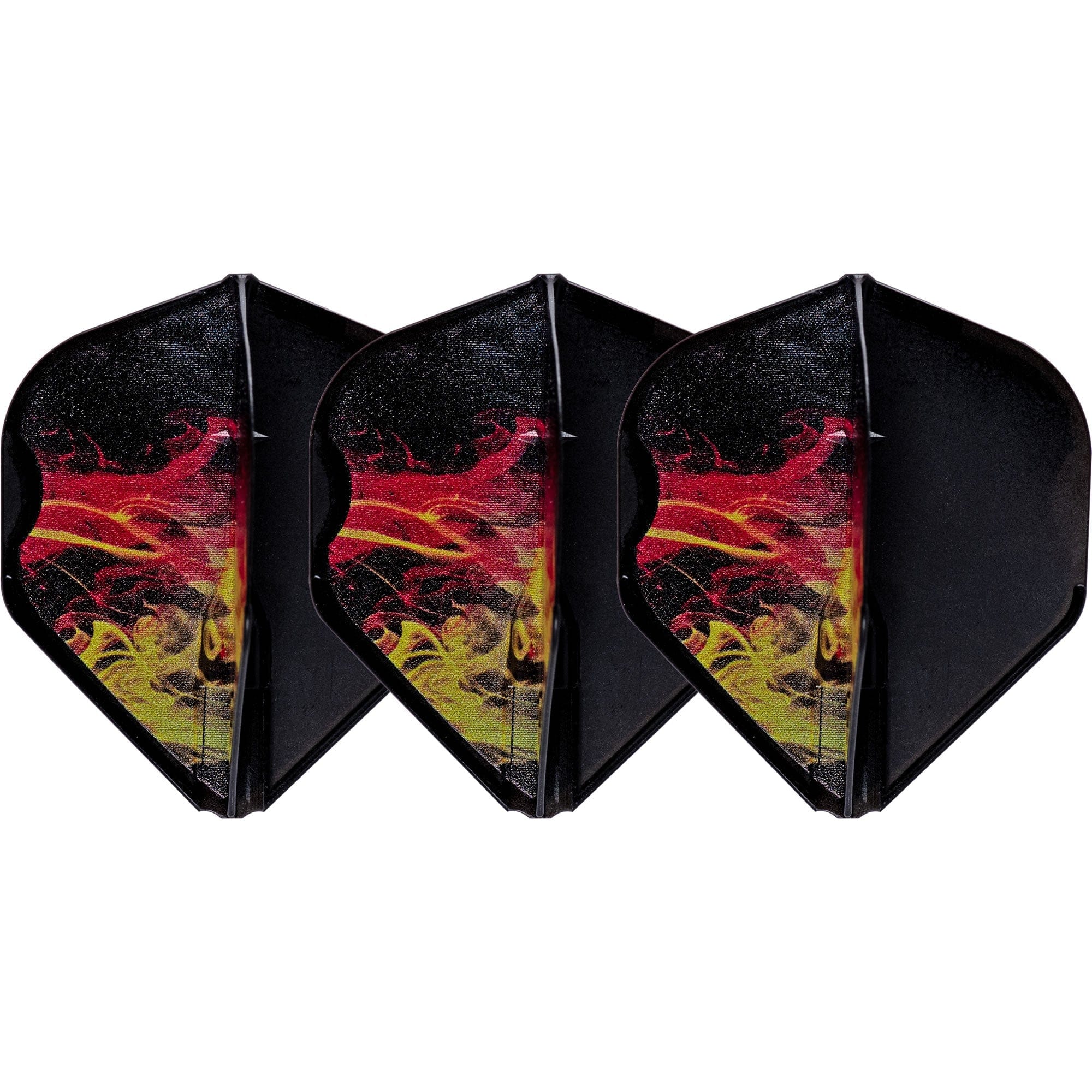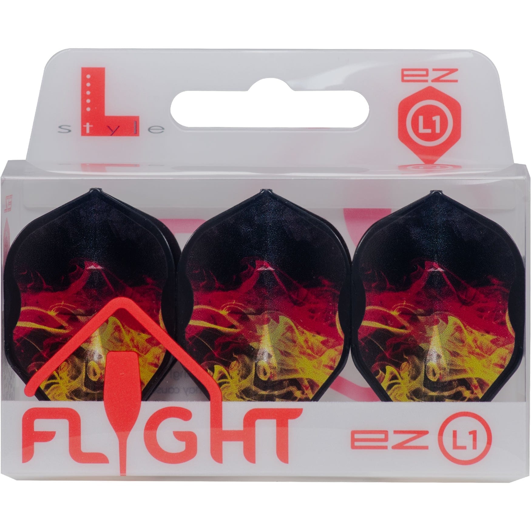 L-Style - EZ L-Flights - Integrated Champagne Ring - L1EZ - RYB Series v1 - Type D - Clear Black. The 1st Edition of the RYB Series flights in black, red and yellow - standard L1 shape. A unique design prepared to represent the colours of Germany on the EZ style fully integrated dart flight. Each pack contains 3 flights.