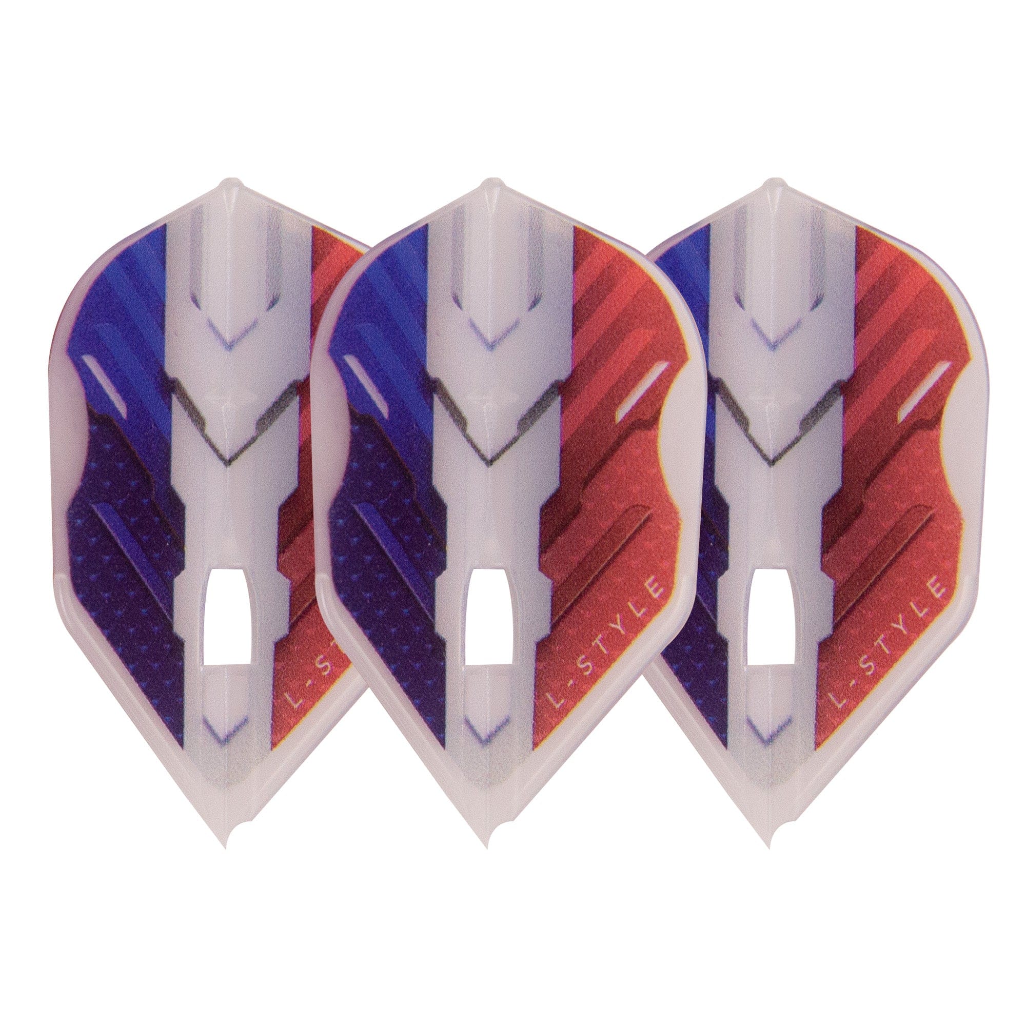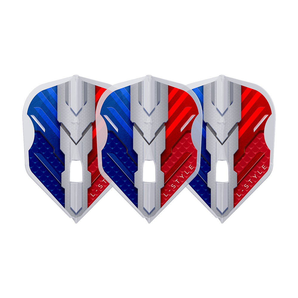 L-Style L-Flights - L1 Pro - Champagne Ring - Standard - V Series Type B - France - Clear White. The 1st Edition of the V Series flights in blue, red and white - standard L1 shape. A unique design prepared to represent the colours of France on the L1 Pro style dart flight. Each pack contains 3 flights.