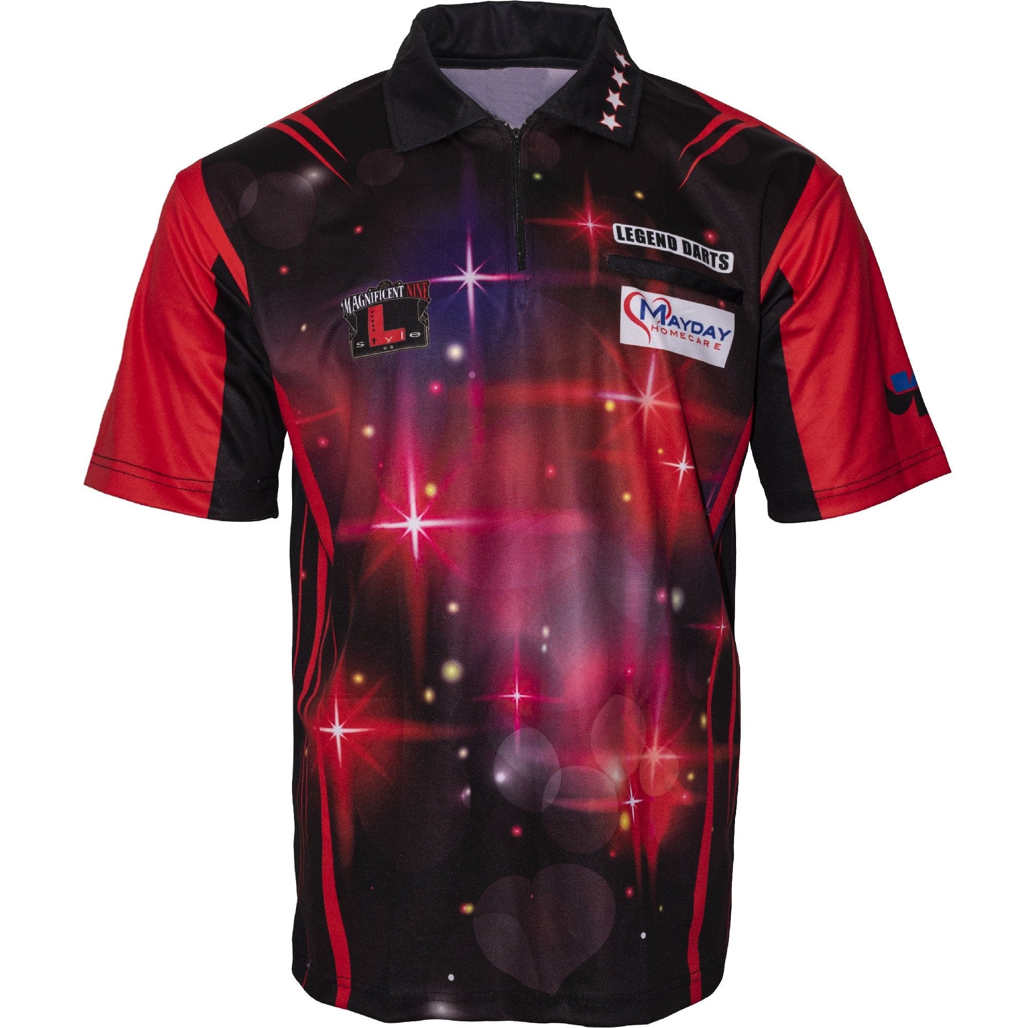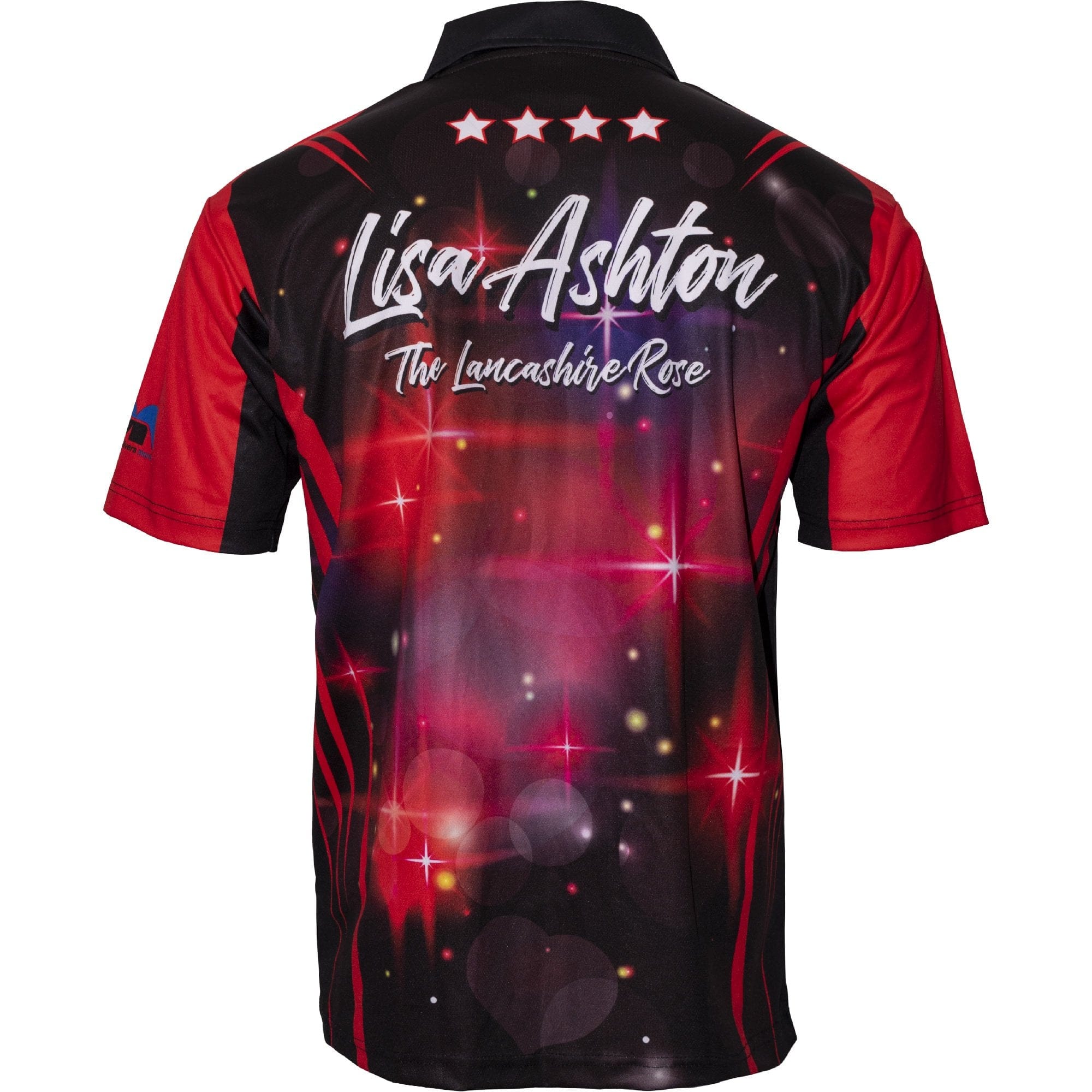 Lisa Ashton Official Dart Shirt. Lightweight with Pocket - highly breathable material. Sizes: Small to 3XL Legend Darts - Lisa Ashton - Dart Shirt - The Lancashire Rose - Red