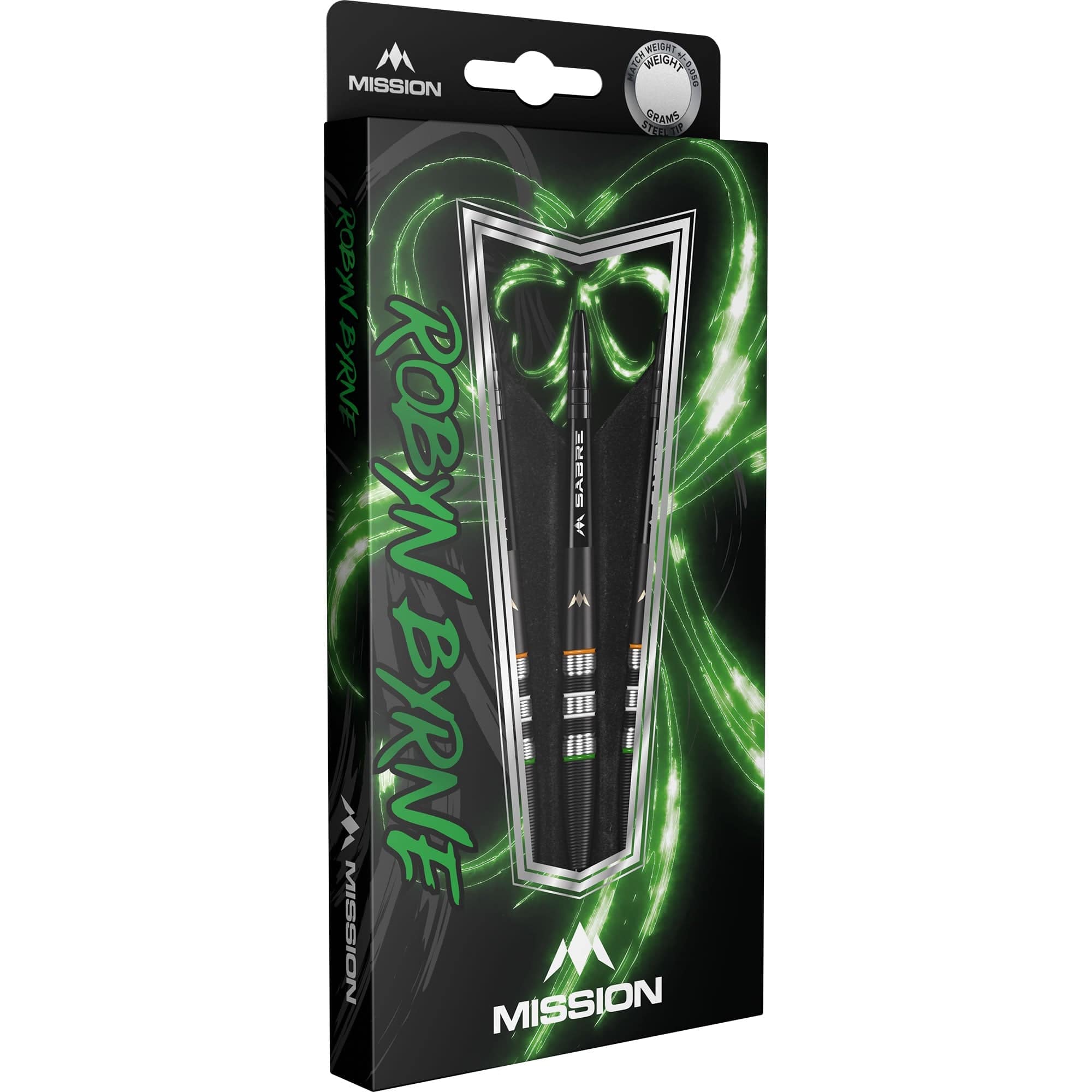 Mission Robyn Byrne Steel Tip Tungsten Darts – 90% Tungsten – Black Titanium. Features: 90% Tungsten Barrels, Black PVD Coating, 1 Set of Mission Flights, 1 Set of Mission Shafts.