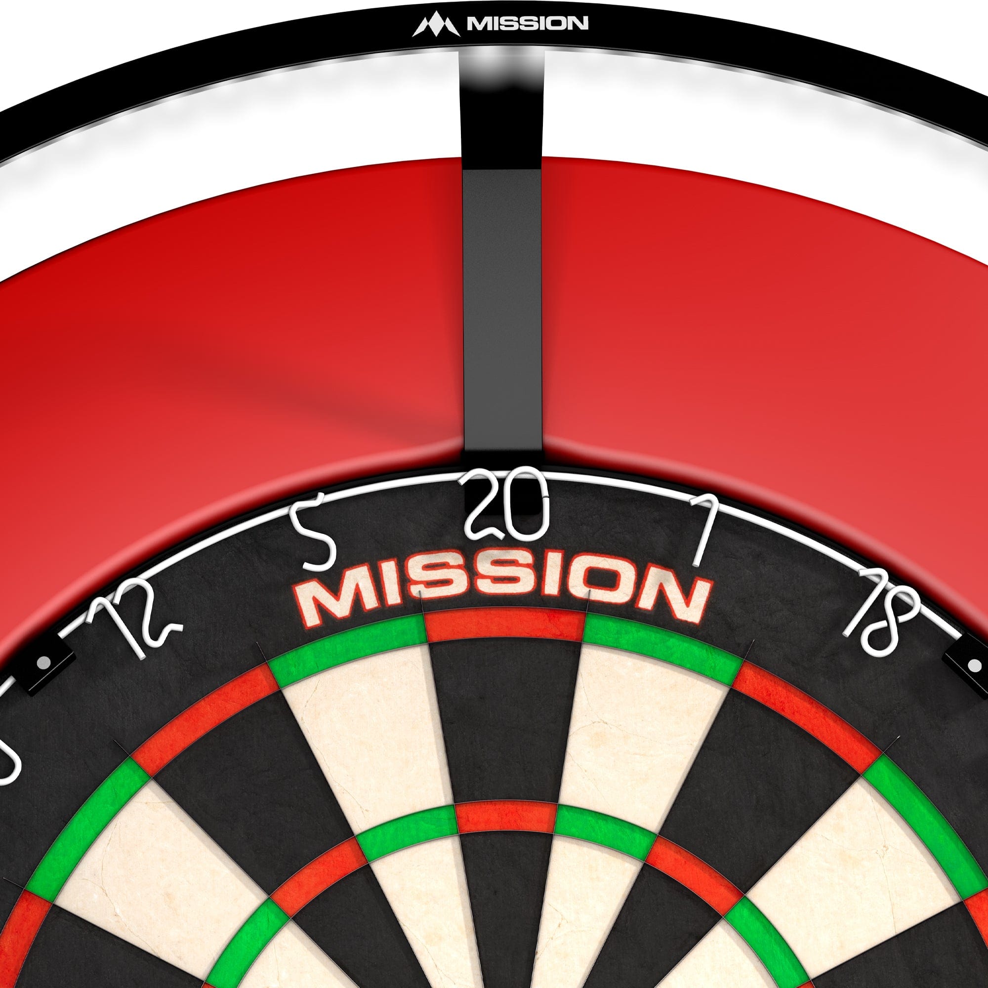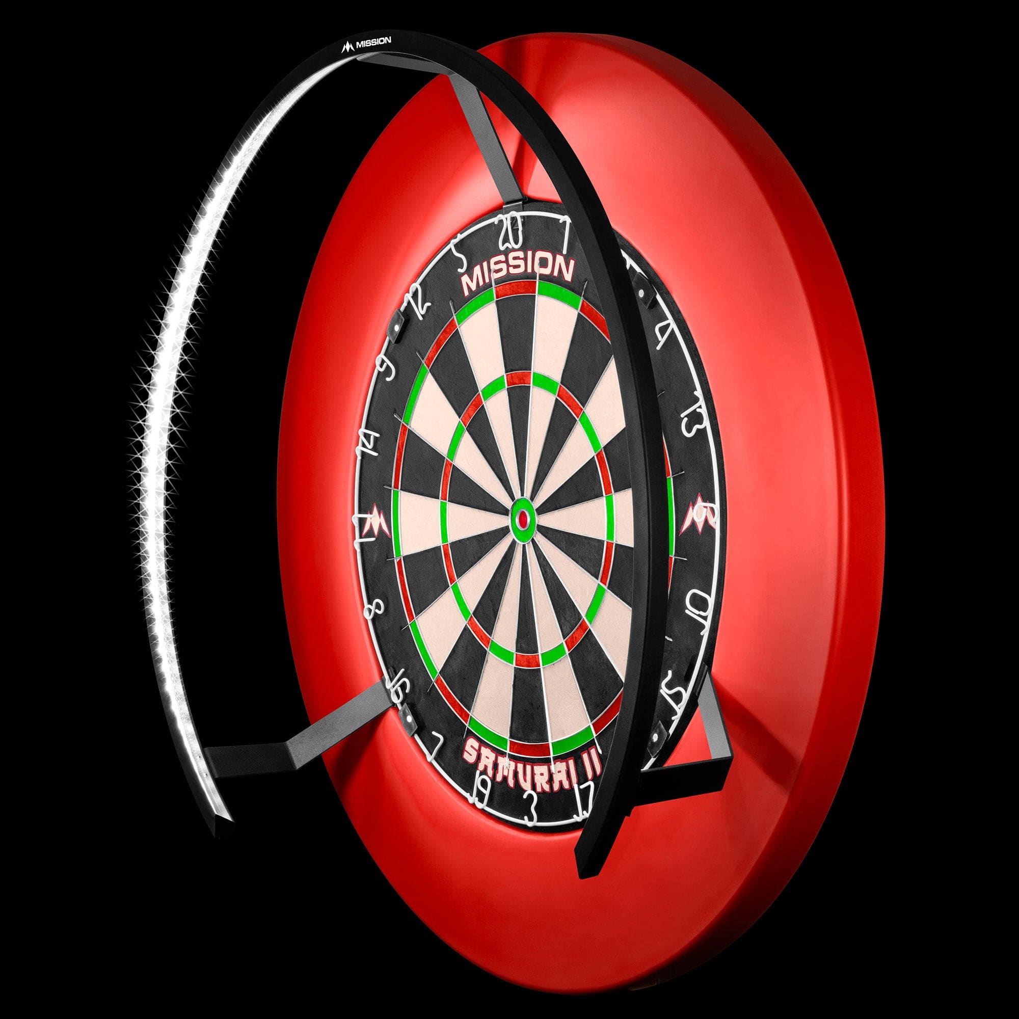 The Torus 270 is a simple way to light your dartboard, without shadows, to improve your vision of the board. The lighting system quickly clips to any dartboard and the unique 270-degree shape gives you easy access to retrieve your darts during play which is ideal for youth players. The lightweight frame features bright white LED lights to illuminate the entire dartboard, all without casting shadows or dazzling players. No matter what existing lighting you have in the room, the Torus 270 dartboard light creates continuous light over your board. In this unique design, the inside edge of the light rail is tilted 25 degrees outwards to allow even more light to reach the board. Once installed your Torus 270 wont moved if knocked. The simple fixings clips firmly onto the dartboard, which means you can use the Torus 270 dartboard light with any bristle board, with a board and surround, or even in a dartboard cabinet. Installation is very simple; use the Allen key provided to fasten the legs to the light frame, and then effortlessly clip the light to your dartboard. Simple! Mission Torus 270 Dartboard Lighting - Bright White Light - ALSO INCLUDES TORUS CLAMP.