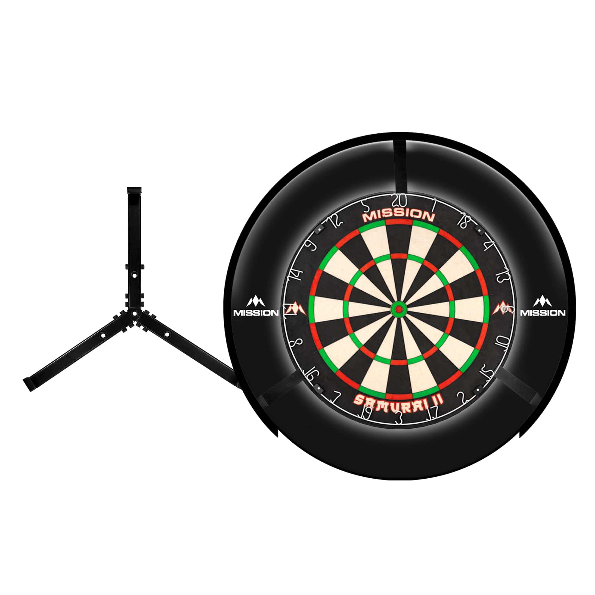 The Torus 270 is a simple way to light your dartboard, without shadows, to improve your vision of the board. The lighting system quickly clips to any dartboard and the unique 270-degree shape gives you easy access to retrieve your darts during play which is ideal for youth players. The lightweight frame features bright white LED lights to illuminate the entire dartboard, all without casting shadows or dazzling players. No matter what existing lighting you have in the room, the Torus 270 dartboard light creates continuous light over your board. In this unique design, the inside edge of the light rail is tilted 25 degrees outwards to allow even more light to reach the board. Once installed your Torus 270 wont moved if knocked. The simple fixings clips firmly onto the dartboard, which means you can use the Torus 270 dartboard light with any bristle board, with a board and surround, or even in a dartboard cabinet. Installation is very simple; use the Allen key provided to fasten the legs to the light frame, and then effortlessly clip the light to your dartboard. Simple! Mission Torus 270 Dartboard Lighting - Bright White Light - ALSO INCLUDES CLAMP, SAMURAI 2, LOGO SURROUND