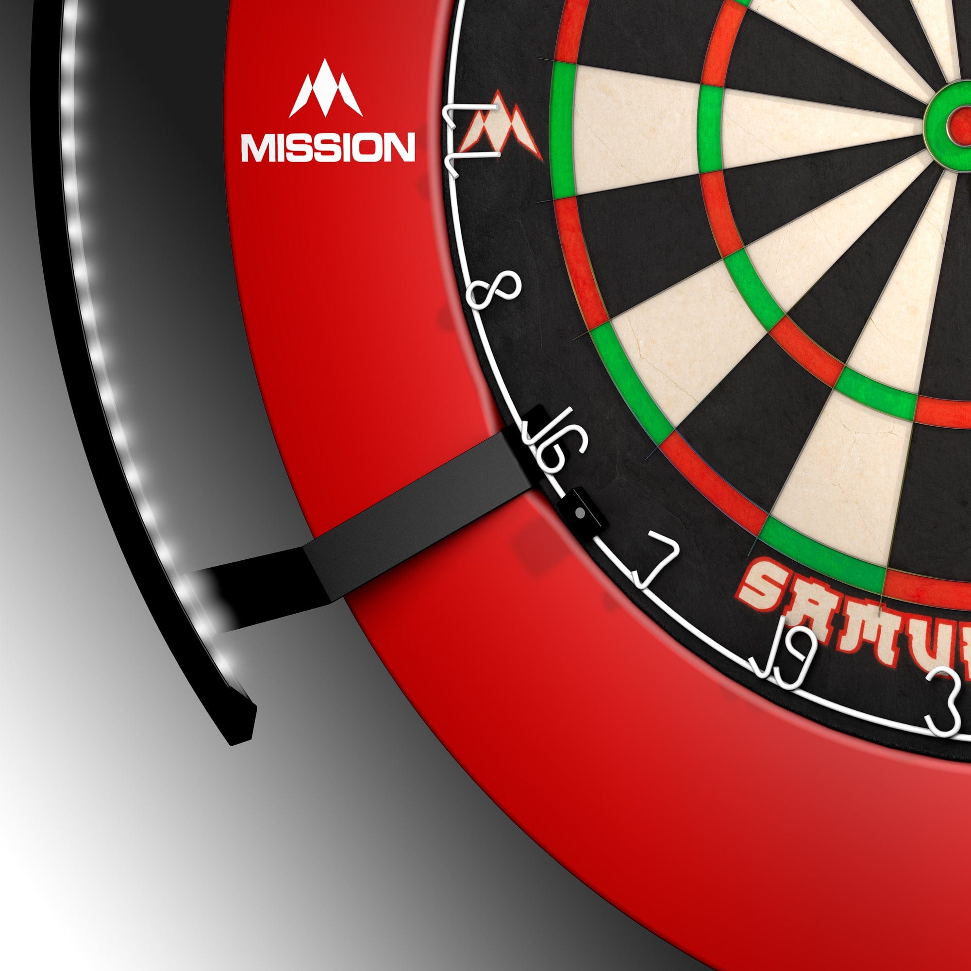 The Torus 270 is a simple way to light your dartboard, without shadows, to improve your vision of the board. The lighting system quickly clips to any dartboard and the unique 270-degree shape gives you easy access to retrieve your darts during play which is ideal for youth players. The lightweight frame features bright white LED lights to illuminate the entire dartboard, all without casting shadows or dazzling players. No matter what existing lighting you have in the room, the Torus 270 dartboard light creates continuous light over your board. In this unique design, the inside edge of the light rail is tilted 25 degrees outwards to allow even more light to reach the board. Once installed your Torus 270 wont moved if knocked. The simple fixings clips firmly onto the dartboard, which means you can use the Torus 270 dartboard light with any bristle board, with a board and surround, or even in a dartboard cabinet. Installation is very simple; use the Allen key provided to fasten the legs to the light frame, and then effortlessly clip the light to your dartboard. Simple! Mission Torus 270 Dartboard Lighting - Bright White Light - ALSO INCLUDES CLAMP, SAMURAI 2, RED LOGO SURROUND