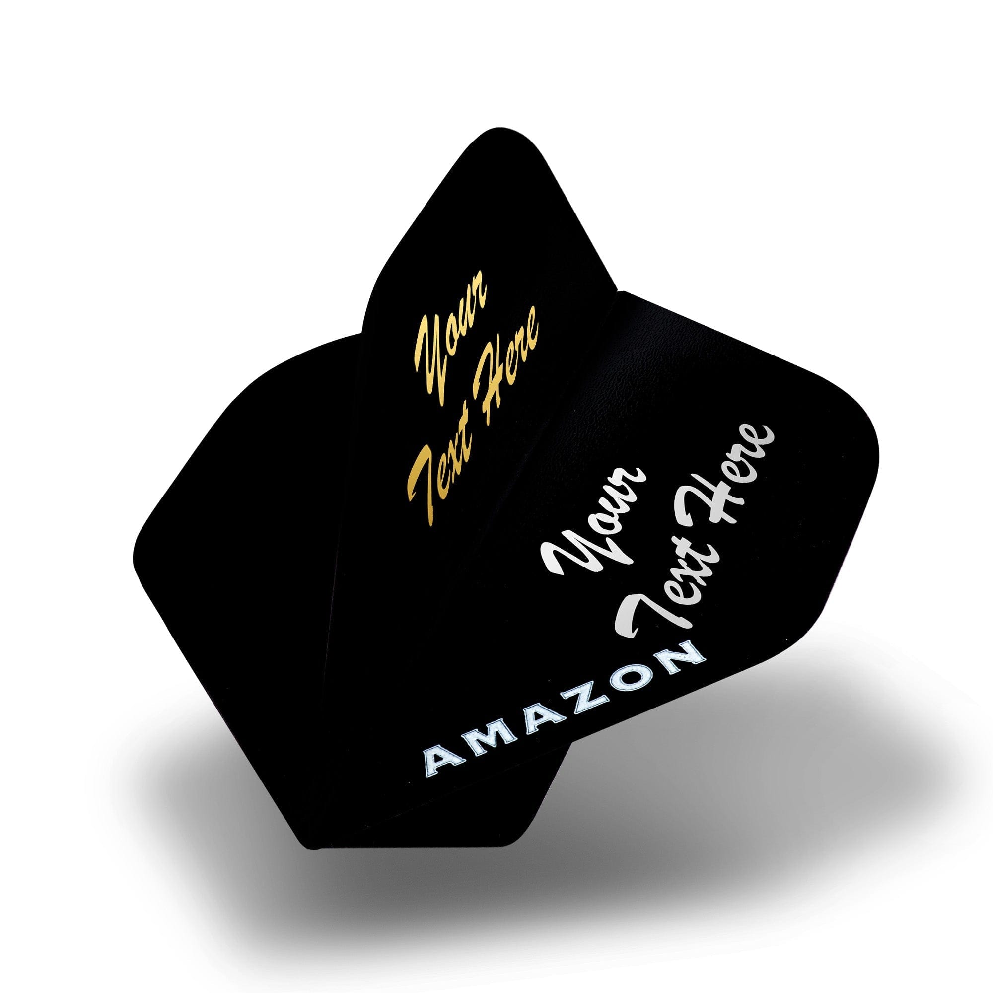 5 Sets of Std Amazon Black Personalised Dart Flights. Available on several different kinds of flights in a choice of Silver or Gold Foil. The results are extremely effective and do not rub off. Personalised flights are printed on 2 sides only. Please enter your details carefully when inputting the text. We will replicate your writing and spelling exactly. We will print the text on the flights and reduce size of text where necessary to best fit the flight. We usually despatch in 2-3 days. If you order additional items with the personalised flights they will all be despatched once the flights are ready. Please note that due to the manufacturing process of foil print occasionally the text outline may not be completely flush and this should be taken into account when ordering.