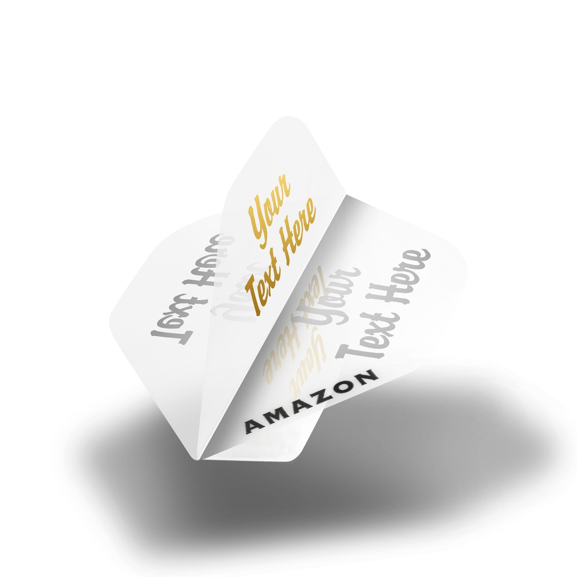 5 Sets of Std Amazon White Personalised Dart Flights. Available on several different kinds of flights in a choice of Silver or Gold Foil. The results are extremely effective and do not rub off. Personalised flights are printed on 2 sides only. Please enter your details carefully when inputting the text. We will replicate your writing and spelling exactly. We will print the text on the flights and reduce size of text where necessary to best fit the flight. We usually despatch in 2-3 days. If you order additional items with the personalised flights they will all be despatched once the flights are ready. Please note that due to the manufacturing process of foil print occasionally the text outline may not be completely flush and this should be taken into account when ordering.