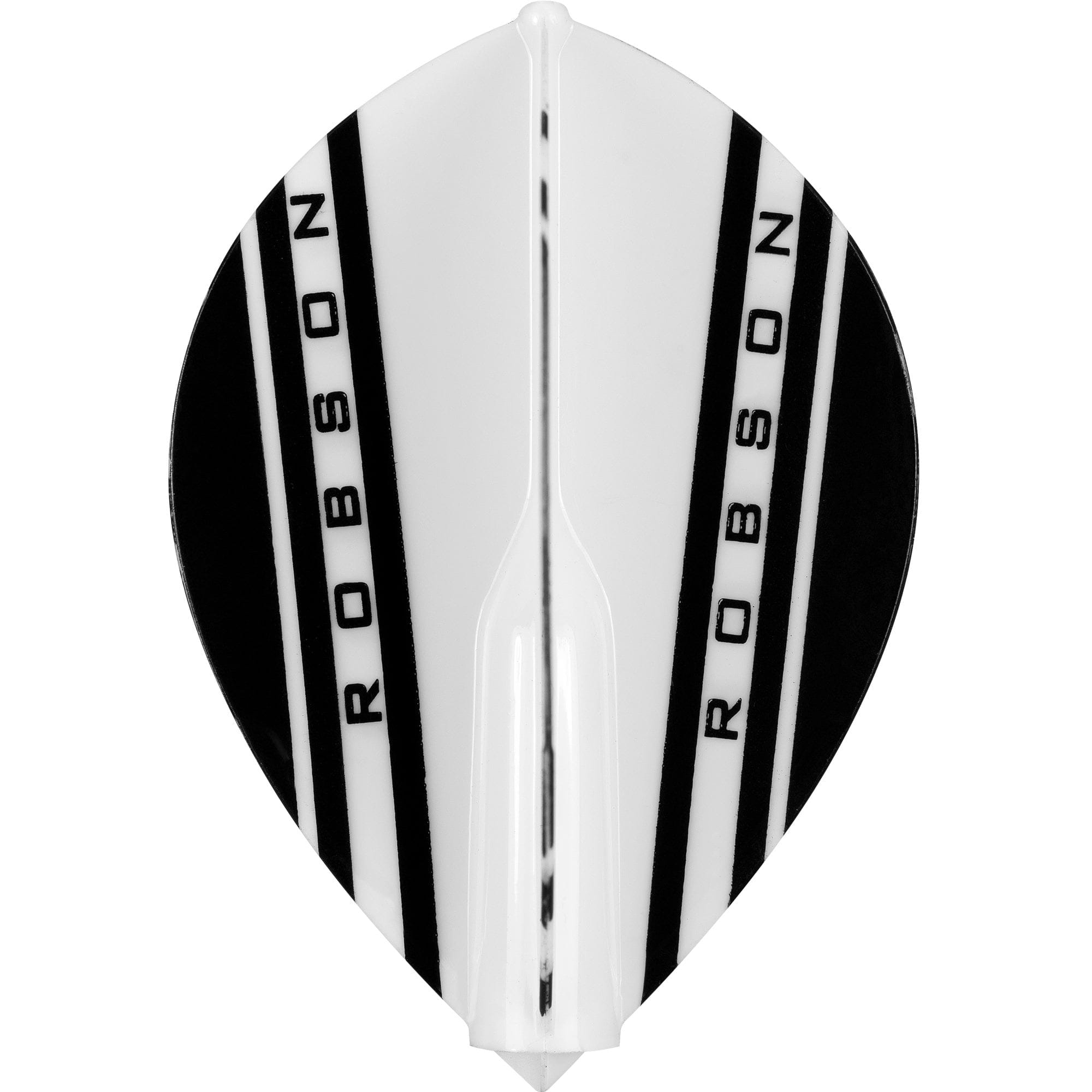 Robson Plus Pear Shape Dart Flights with V design. Made from a moulded plastic, these white flights simply push onto your normal shaft to give you a solid professional setup. As the flights do not have a specialist fitting, these white flights can be used on most nylon and aluminium shafts. Each pack is provided as one set of 3 flights.