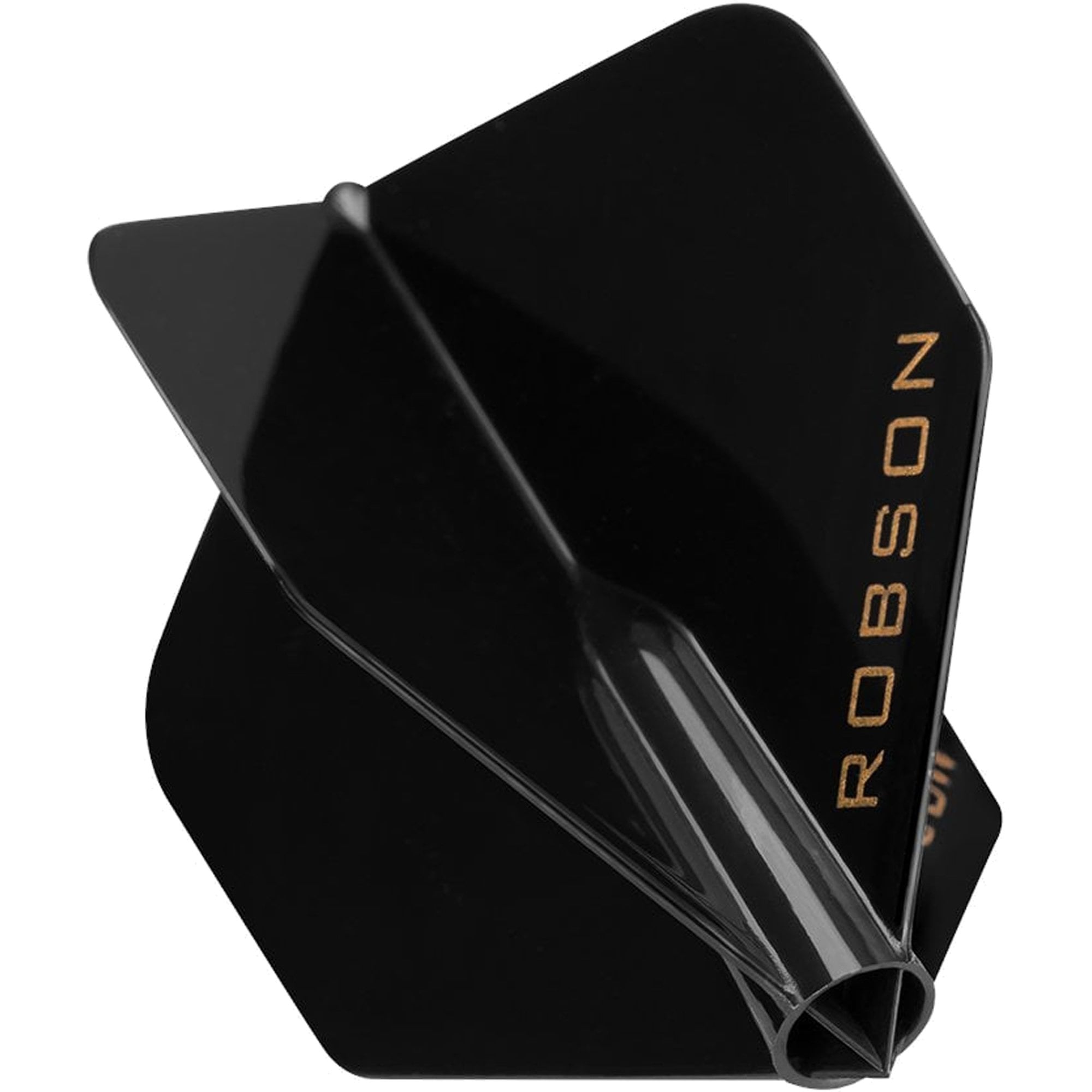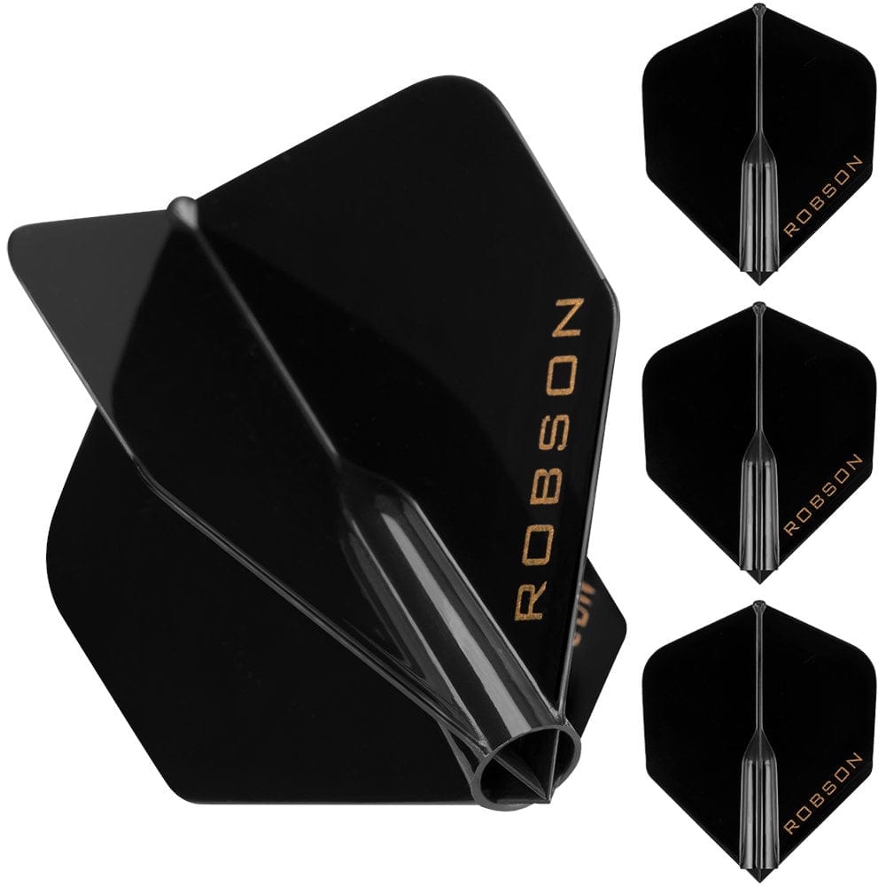 Robson Plus Standard Shape Dart Flights. Made from a moulded plastic, these black flights simply push onto your normal shaft to give you a solid professional setup. As the flights do not have a specialist fitting, these black flights can be used on most nylon and aluminium shafts. Each pack is provided as one set of 3 flights.