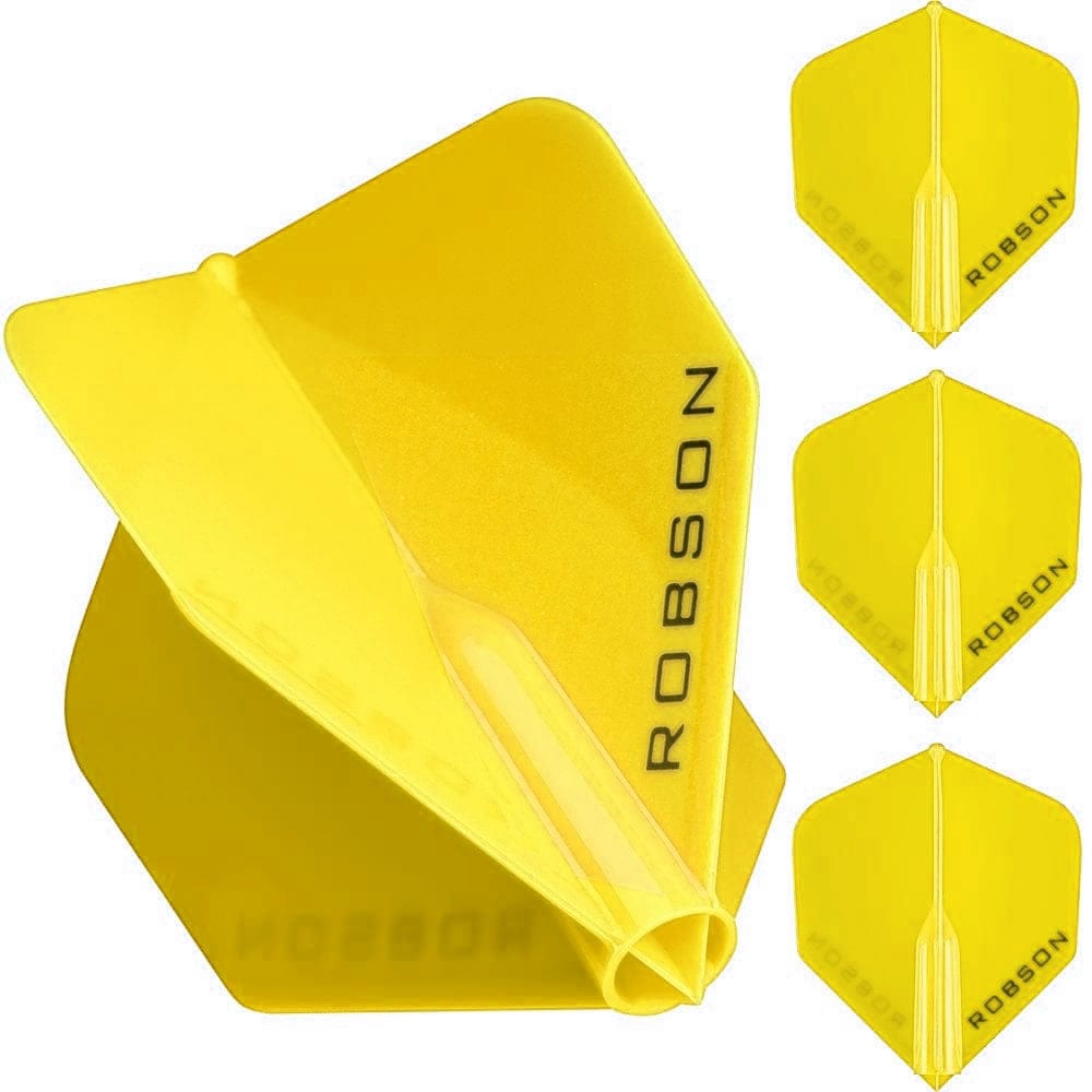 Robson Plus Standard Shape Dart Flights. Made from a moulded plastic, these yellow flights simply push onto your normal shaft to give you a solid professional setup. As the flights do not have a specialist fitting, these yellow flights can be used on most nylon and aluminium shafts. Each pack is provided as one set of 3 flights.
