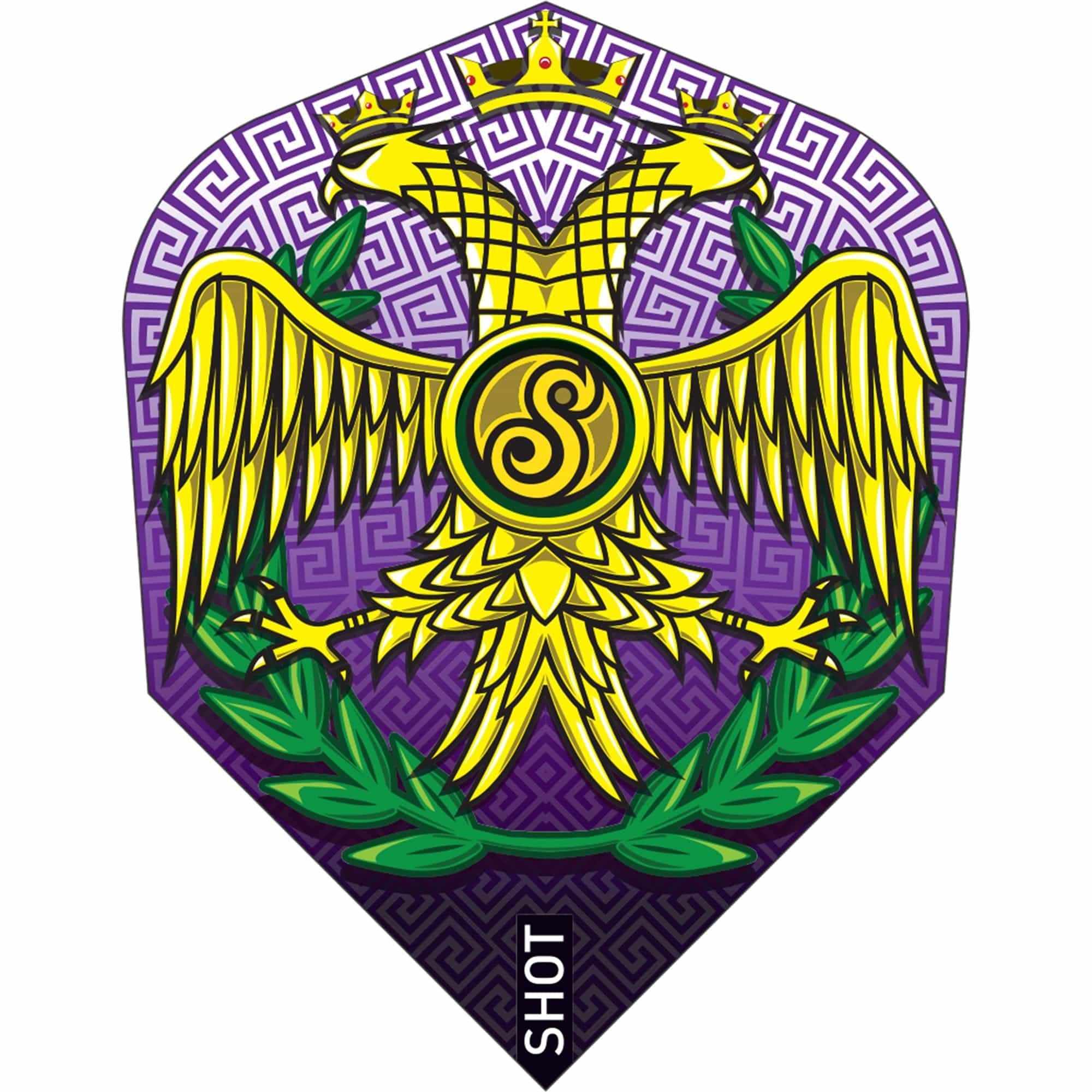 Shot Roman Empire 100 Micron Std No6 Caesar Dart Flights. A great addition to any darts set up. These 100 Micron flights feature a Purple patterned background with a large ornate yellow design with a small Shot logo on the tip of the dart flight. Each set contains 3 flights.