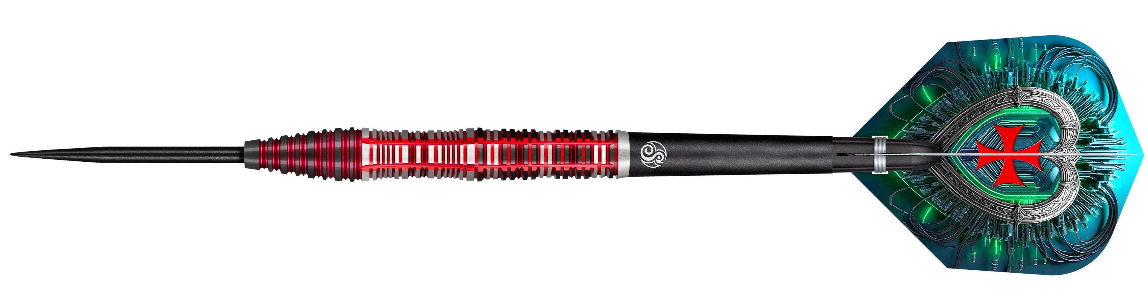 Shot Future Knights Darts - Steel Tip - 90% Tungsten - Dreadheart - 24g. Dreadheart ruled kingdoms in another life— born to lead rebellions and topple empires. With an aggressive tapered nose to reduce deflections, this set's center scallop is the battle master; all the surfaces are re-machined for a powerful interlock of skin and metal. Aggressive square cuts at the rear, accentuated by silver bands in a pyramid formation, deliver an unyielding grip for total control. Dreadheart is an imposing mix of knightly vibes and pure intimidation; it's time to rewrite history.