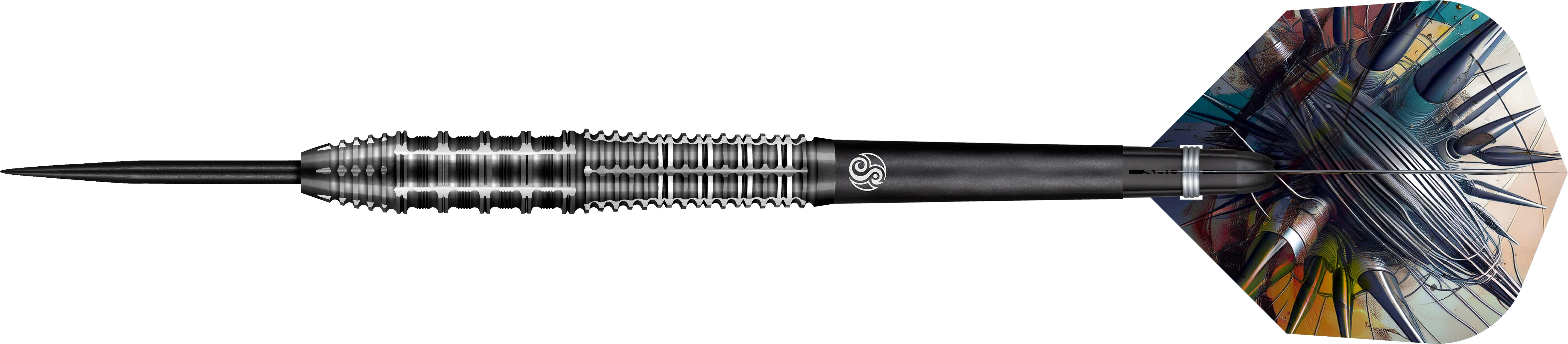 Shot Gnarly Darts - Steel Tip - 90% Tungsten - Rippah - 26g. A fusion of rings and V cuts are machined into the tail; black titanium rings surge upwards, serrating the rear grip. Pillar rings dominate the front of the barrel; your fingers feel the deep spaces between them, creating one of the firmest push points Shot has ever made. A long tapered nose is chiseled with rings and V-shaped milling. This barrel has grip from nose to tail without compromise.