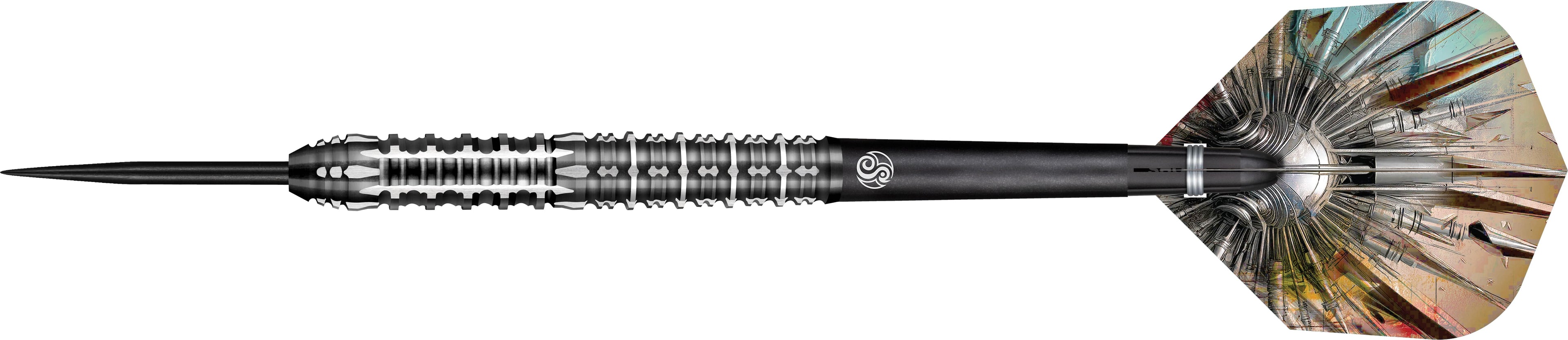 Shot Gnarly Darts - Steel Tip - 90% Tungsten - Shreddah - 23g. Cut into the tail is a unique double-ring grip; the silver rings peak above, forming ridges you can feel. The front of the barrel has a vicious grip of razor rings and square peaks, layered with V cutter milling, a grip that's consistent and relentless—finished with a round tapered nose cut with milling and rings, completing the nose-to-tail grip profile on this barrel.