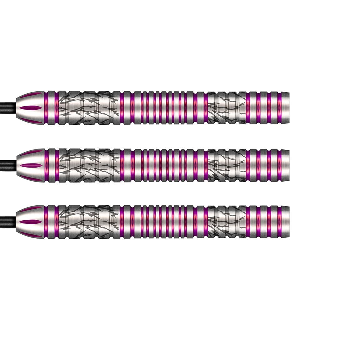 Shot Pro Series Darts - Steel Tip - 90% Tungsten - Barbora Hospodárská 2.0 - 23g. Barbora’s new Pro Series barrel features a slim, straight design with a subtle front taper for a smooth, streamlined feel. With three clearly defined grip zones—front, middle, and rear—it offers versatility for different throwing styles. Softer and lighter on the grip level but packed with confidence, this well-balanced and stylish dart is designed for women who want control without compromise.