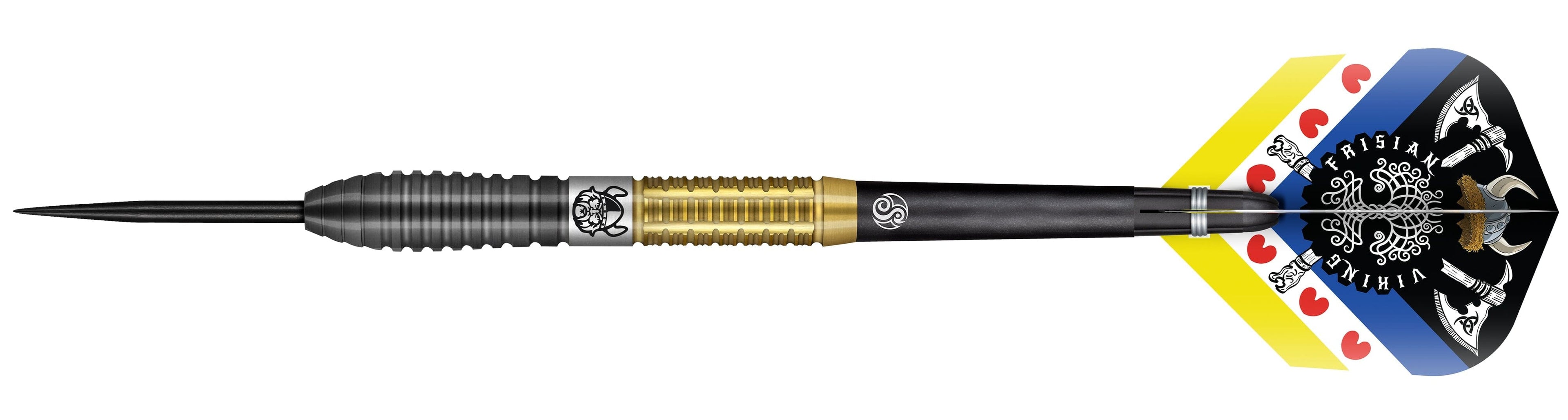 Shot Pro Series Darts - Steel Tip - 90% Tungsten - Jitse van der Wal - 26g. Jitse van der Wal's stunning two-tone titanium Pro Series dart set is a highly engineered offering that balances terrific looks and performance. The nose with fine shark cuts to reduce deflections is a smart design choice, especially for tighter groupings. The progressive traction on the ring grip towards the push point caters well to players who prefer a dynamic grip transition. Corrugated rings with long mill cuts at the tail provide a consistent yet non-sticky feel, which is excellent for controlled releases.