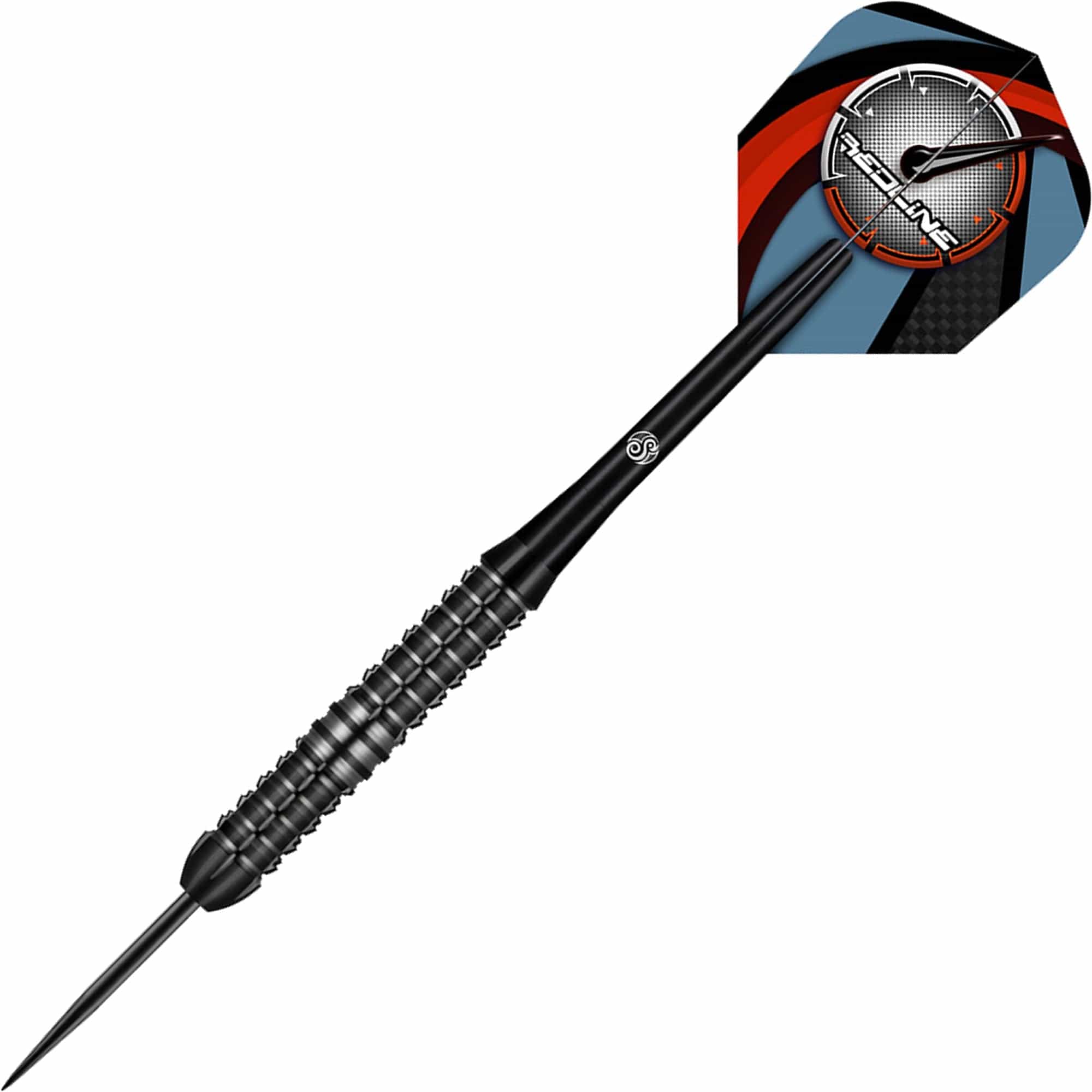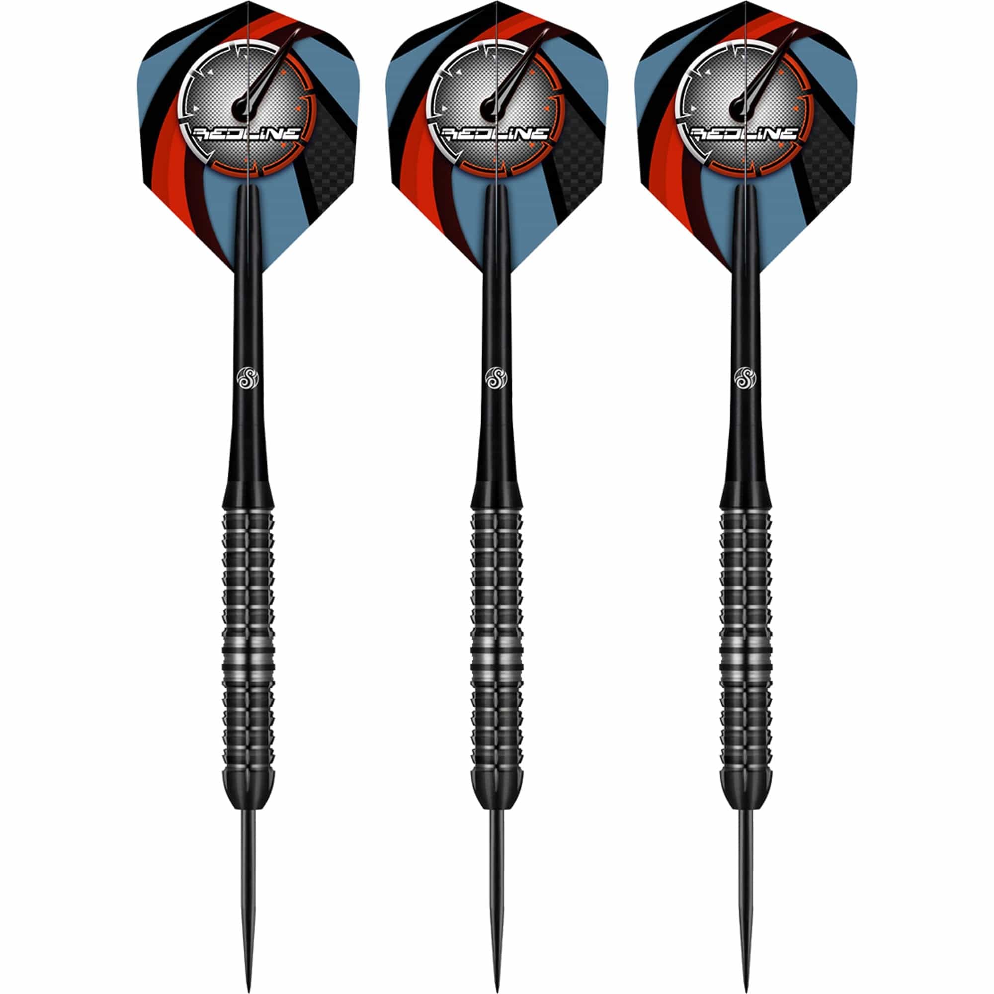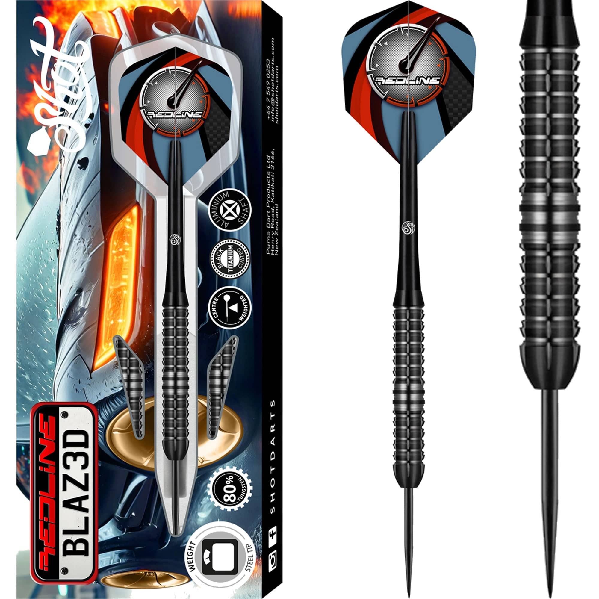 Shot Redline Darts - Steel Tip - 80% Tungsten - BLAZ3D - 28g. Straight off the blocks, BLAZ3D brings muscle to the game with a beast mode 5/5 grip level, a flawless straight shape, and sleek black titanium coating. This darts set looks good and delivers under the hood with mill-cut double shark grips dominating the barrels' front and rear, while the conical nose with smooth vertical cuts gives maxed-out traction. With ultra-durable Aluminium shafts included, max out BLAZ3D superior handling and real pulling power.