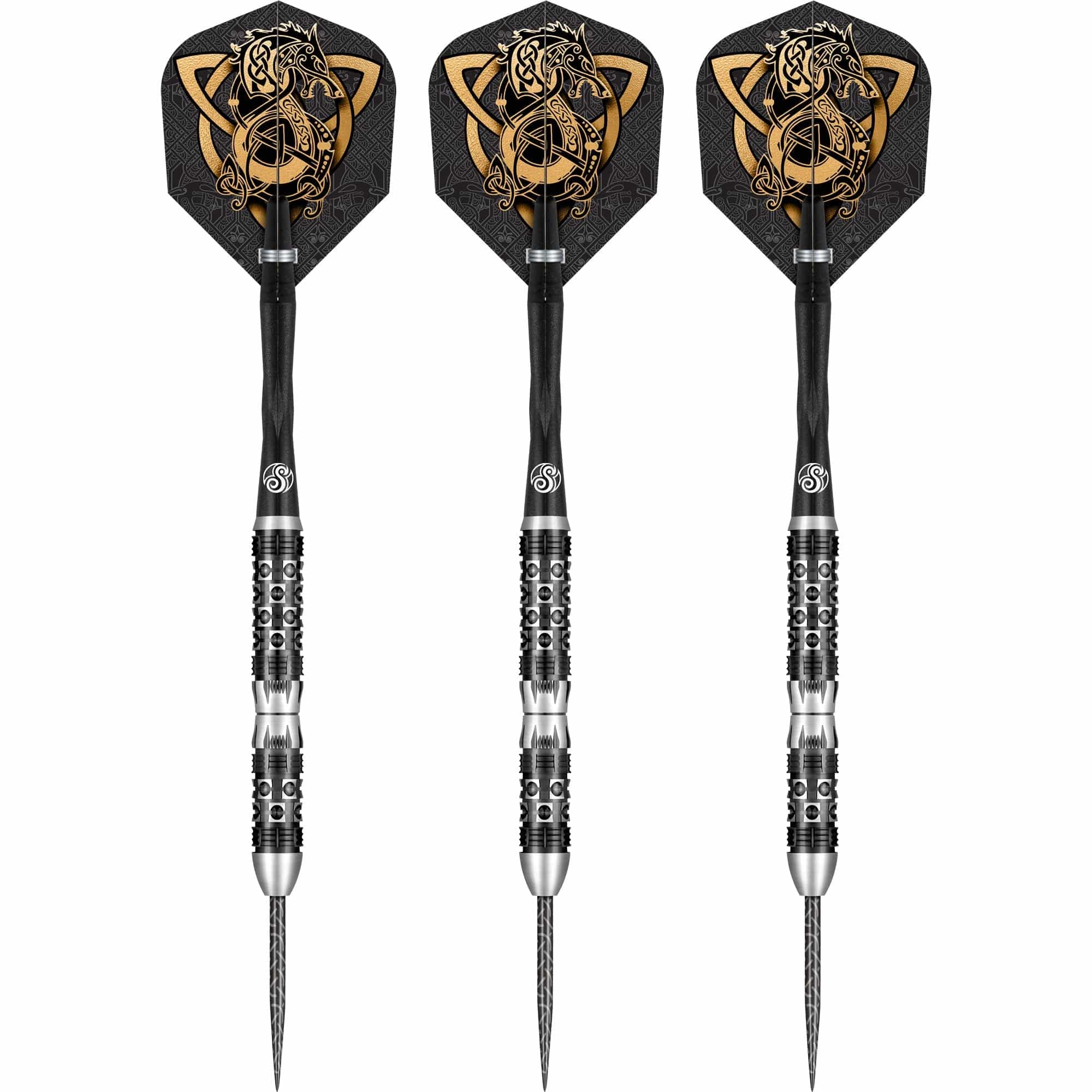 Shot Viking Darts - Steel Tip - 90% Tungsten - Wolf - 23g. Viking Wolf features a long, smooth nose to reduce deflections. The stabilizing Fang grip, milled into the center scallop, offers plenty of cuts for enhanced grip. Equipped with Shot's Siege grip in the tail, made from three CNC milling tools layered together to create a craved feel that offers control in all directions. Flanked by super grip rings on either side, this barrel design provides added traction as the barrel rotates in your fingers.
