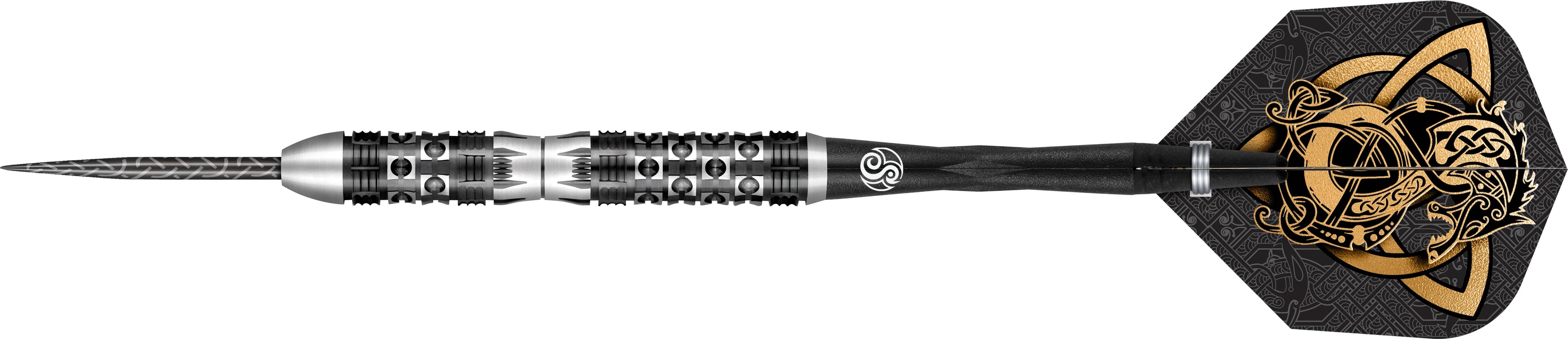 Shot Viking Darts - Steel Tip - 90% Tungsten - Wolf - 25g. Viking Wolf features a long, smooth nose to reduce deflections. The stabilizing Fang grip, milled into the center scallop, offers plenty of cuts for enhanced grip. Equipped with Shot's Siege grip in the tail, made from three CNC milling tools layered together to create a craved feel that offers control in all directions. Flanked by super grip rings on either side, this barrel design provides added traction as the barrel rotates in your fingers.
