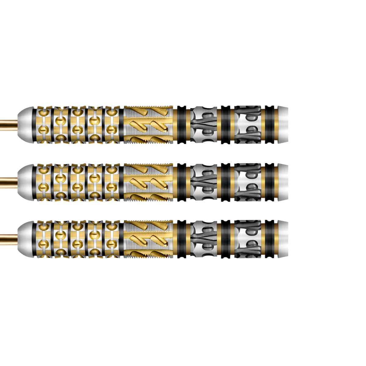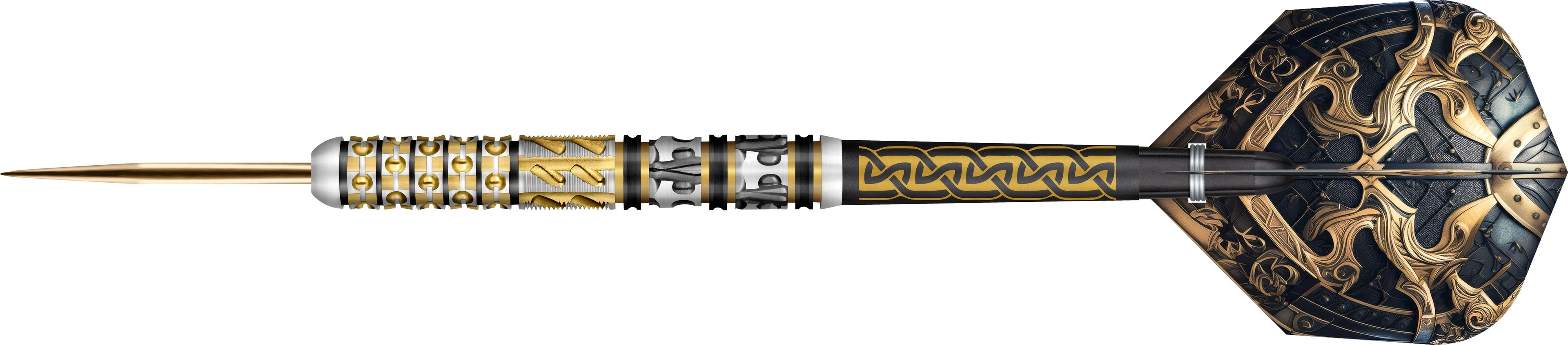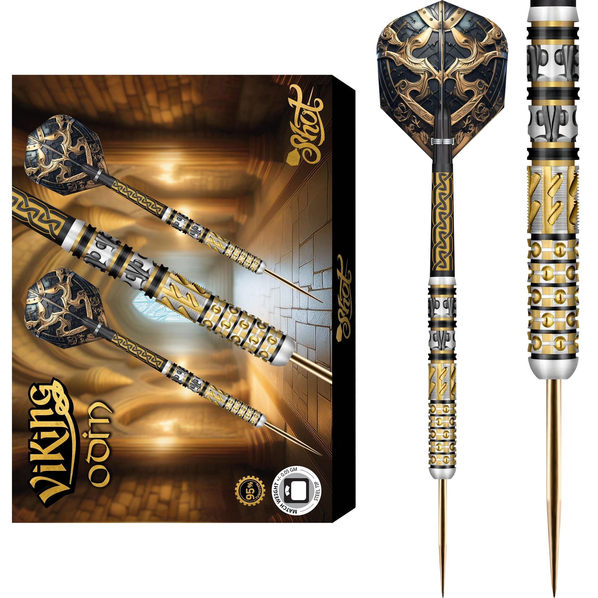Shot Viking Darts - Steel Tip - 95% Tungsten - Odin - 25g. A traditional bull nose is followed by rings of mighty Siege grip, a signature of the Viking range. Milled into the center is the Fehu rune layered with a micro grip, resulting in a rugged solid grip. The tail is adorned with the hammer Mjölnir, precision cut with carbide ball nose tooling; the edges on this grip are legendary. At over 9 minutes of machine time per barrel, this dart is the pinnacle of Shot Craftmanship.