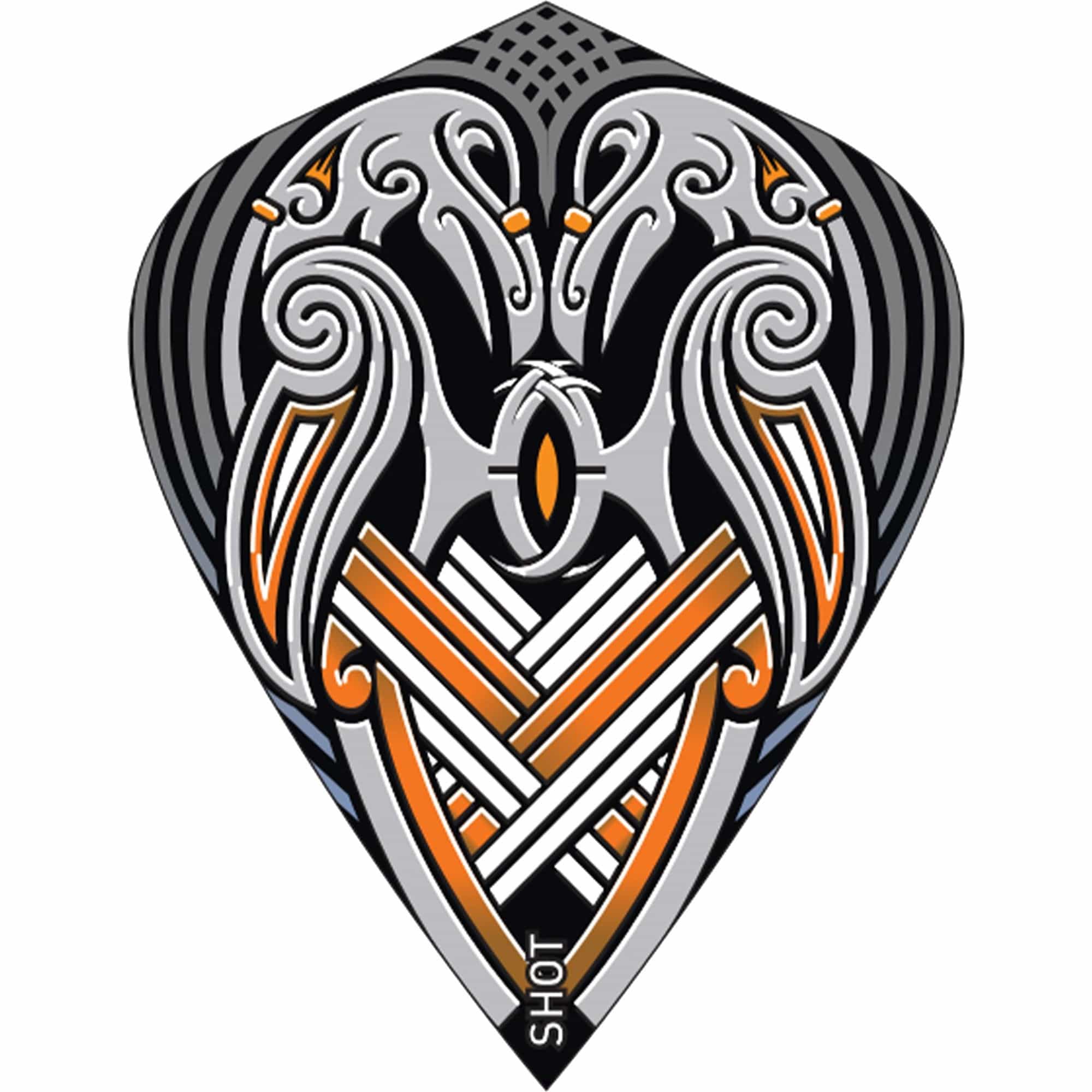 Shot Viking Raven 100 Micron Kite Black Dart Flights. These Kite shaped dart flights would be a great addition to any darts players set up. These flights feature a Black background with a Grey and Orange ornate design across the flight and a small Shot logo at the tip. Each set contains 3 flights.