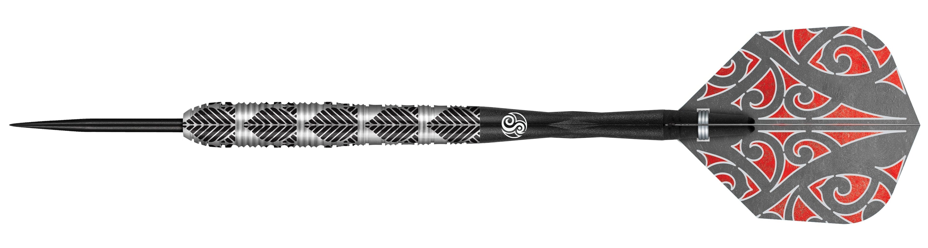 Shot Warrior Darts - Steel Tip - 90% Tungsten - Awe - 26g. The Awe's torpedo shape is perfect for players who grip at the front. A short nose with .5mm grooves is followed by a double-toothed ring grip machined along the barrel. The design has a rear taper, which aids the balance at the front. Wide smooth rings are added between each band on the tail section, resulting in a less aggressive grip. This set has a cinder grip in a tribal design, adding superfine traction and control.