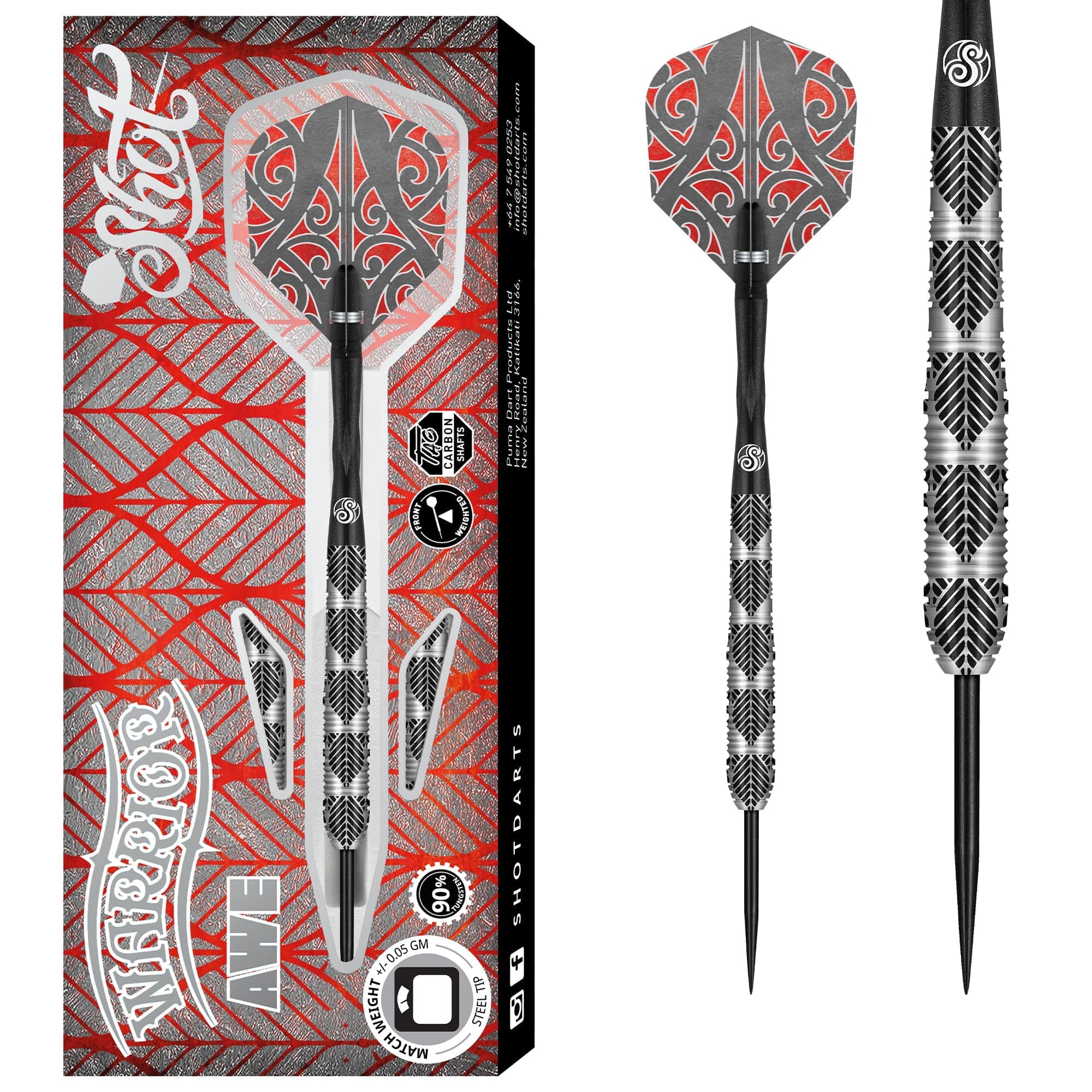 Shot Warrior Darts - Steel Tip - 90% Tungsten - Awe - 24g. The Awe's torpedo shape is perfect for players who grip at the front. A short nose with .5mm grooves is followed by a double-toothed ring grip machined along the barrel. The design has a rear taper, which aids the balance at the front. Wide smooth rings are added between each band on the tail section, resulting in a less aggressive grip. This set has a cinder grip in a tribal design, adding superfine traction and control.