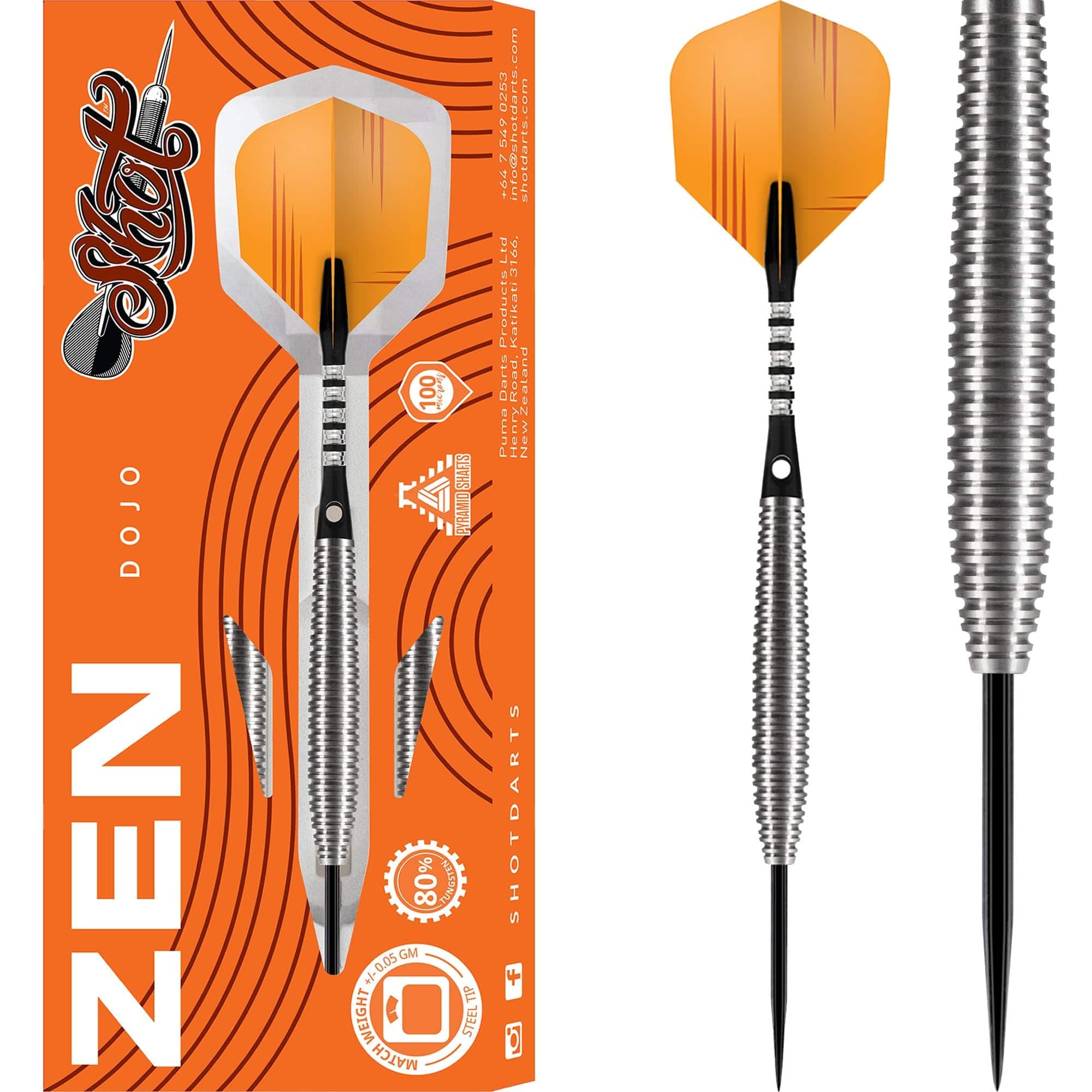 Shot Zen Series - Dojo 80% Steel Tip Tungsten Darts. Features: 80% Tungsten Barrels, Shot Flights, Shot Shafts.
