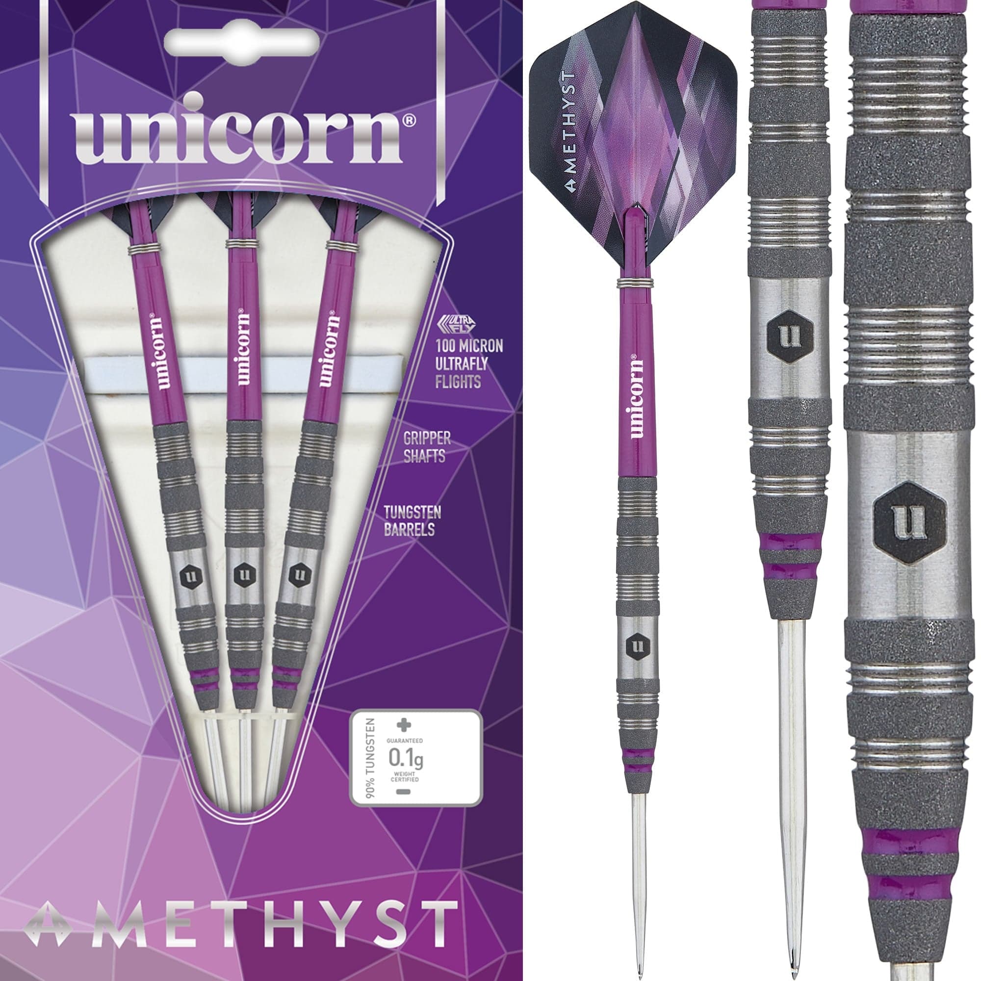 Unicorn Amethyst Darts - Steel Tip - Utech - Style 2 - Sandblasted - 19g. These 90% tungsten darts from the Utech range feature a striking tactile sandblasted finish for that extra grip. They contain a double purple ring at the front of the barrel to complete the look. Includes Ultrafly flights and Gripper shafts.