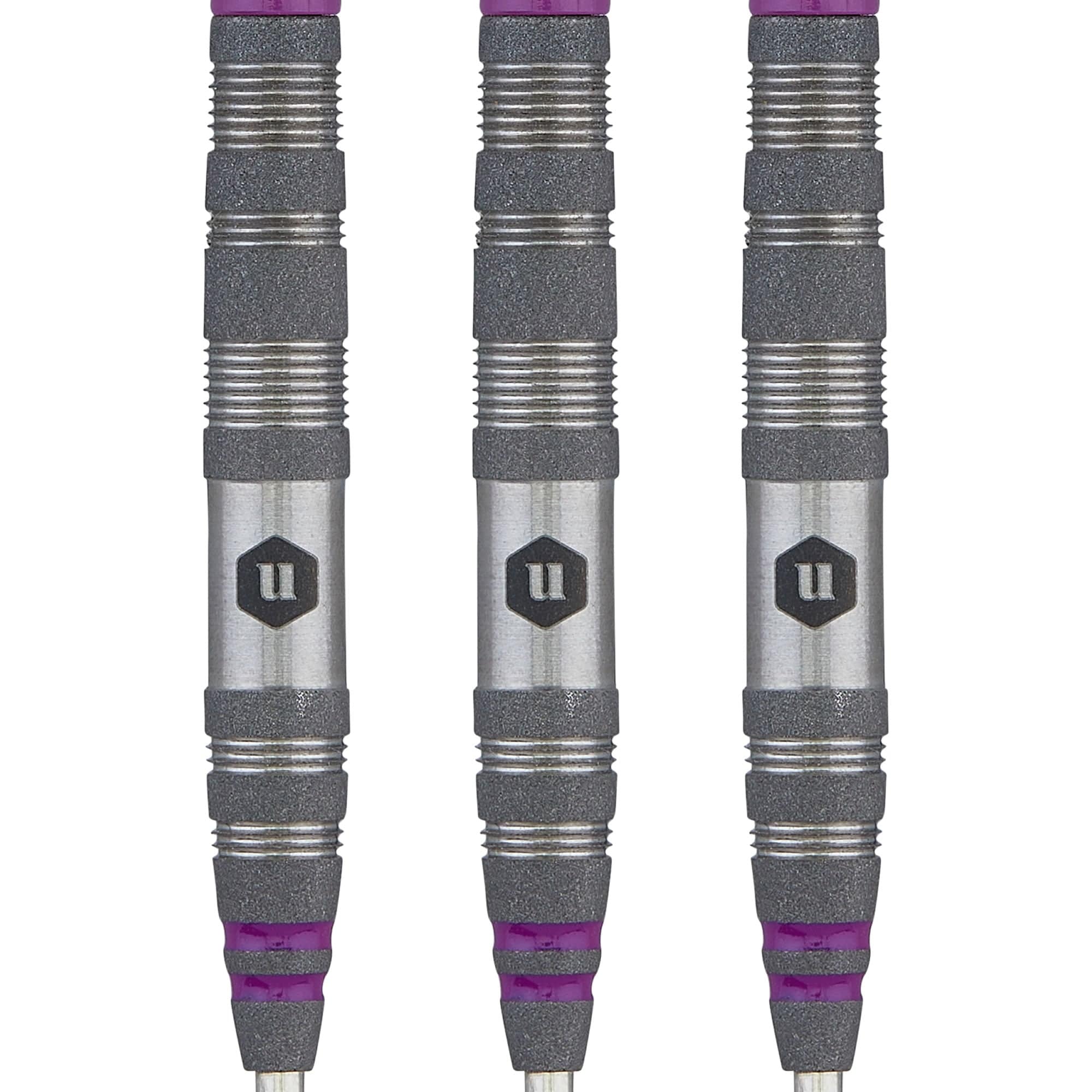 Unicorn Amethyst Darts - Steel Tip - Utech - Style 2 - Sandblasted - 21g. These 90% tungsten darts from the Utech range feature a striking tactile sandblasted finish for that extra grip. They contain a double purple ring at the front of the barrel to complete the look. Includes Ultrafly flights and Gripper shafts.