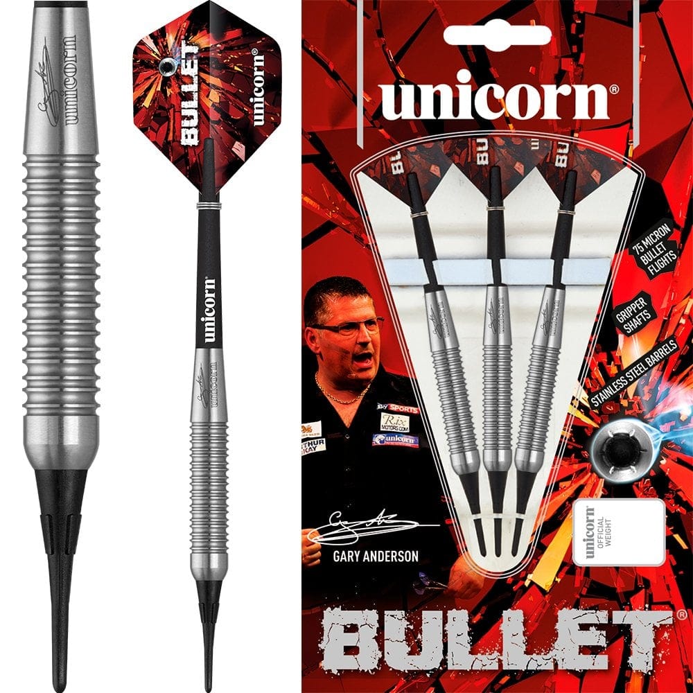 Gary Anderson Unicorn Bullet Darts. All Unicorn Bullet Darts feature: Stainless Steel Super Durable Barrels, Engraved Unicorn hallmark of quality, Gripper Shafts, Unicorn Flights. Unicorn Bullet Darts - Soft Tip Stainless Steel - GA1 - Gary Anderson